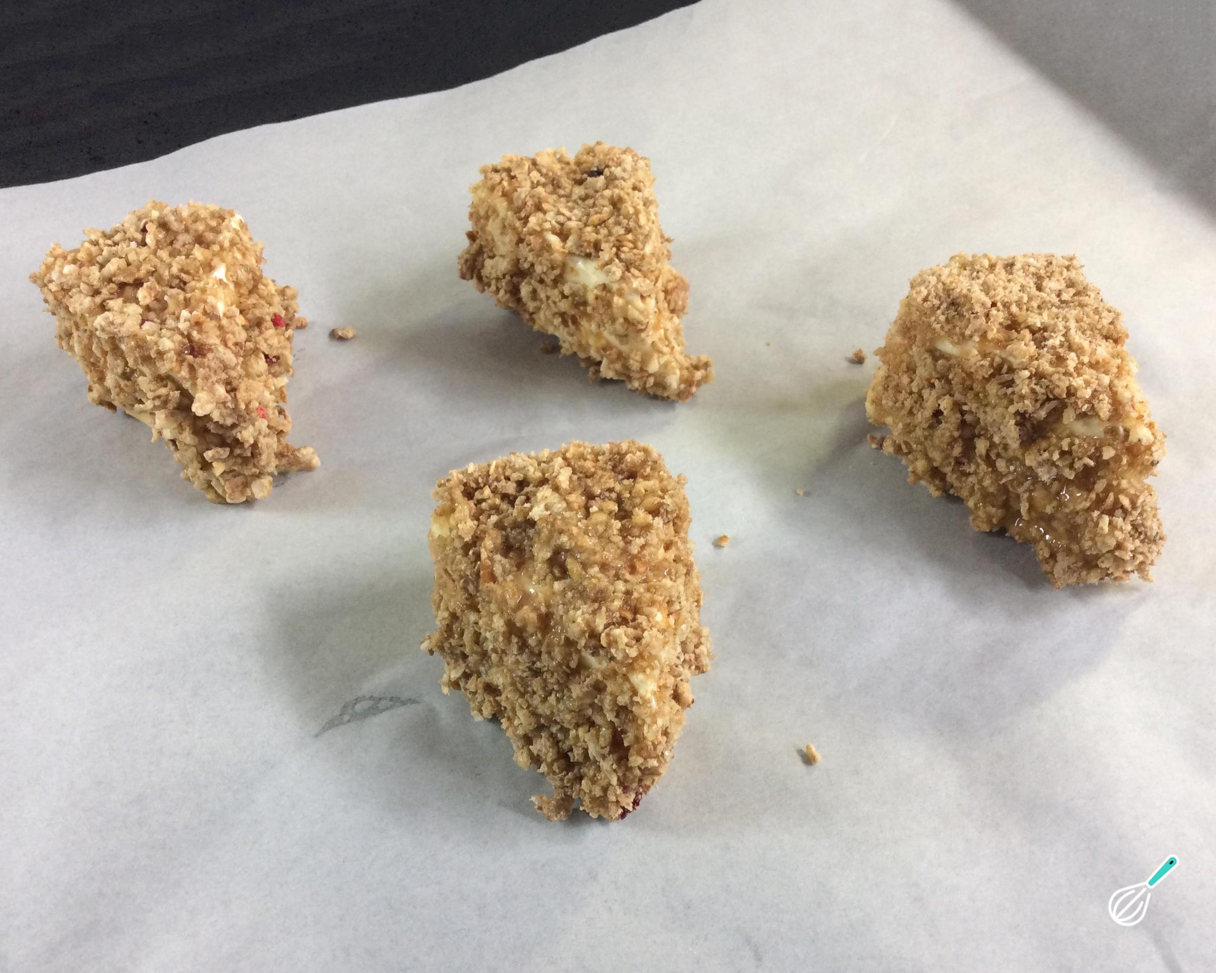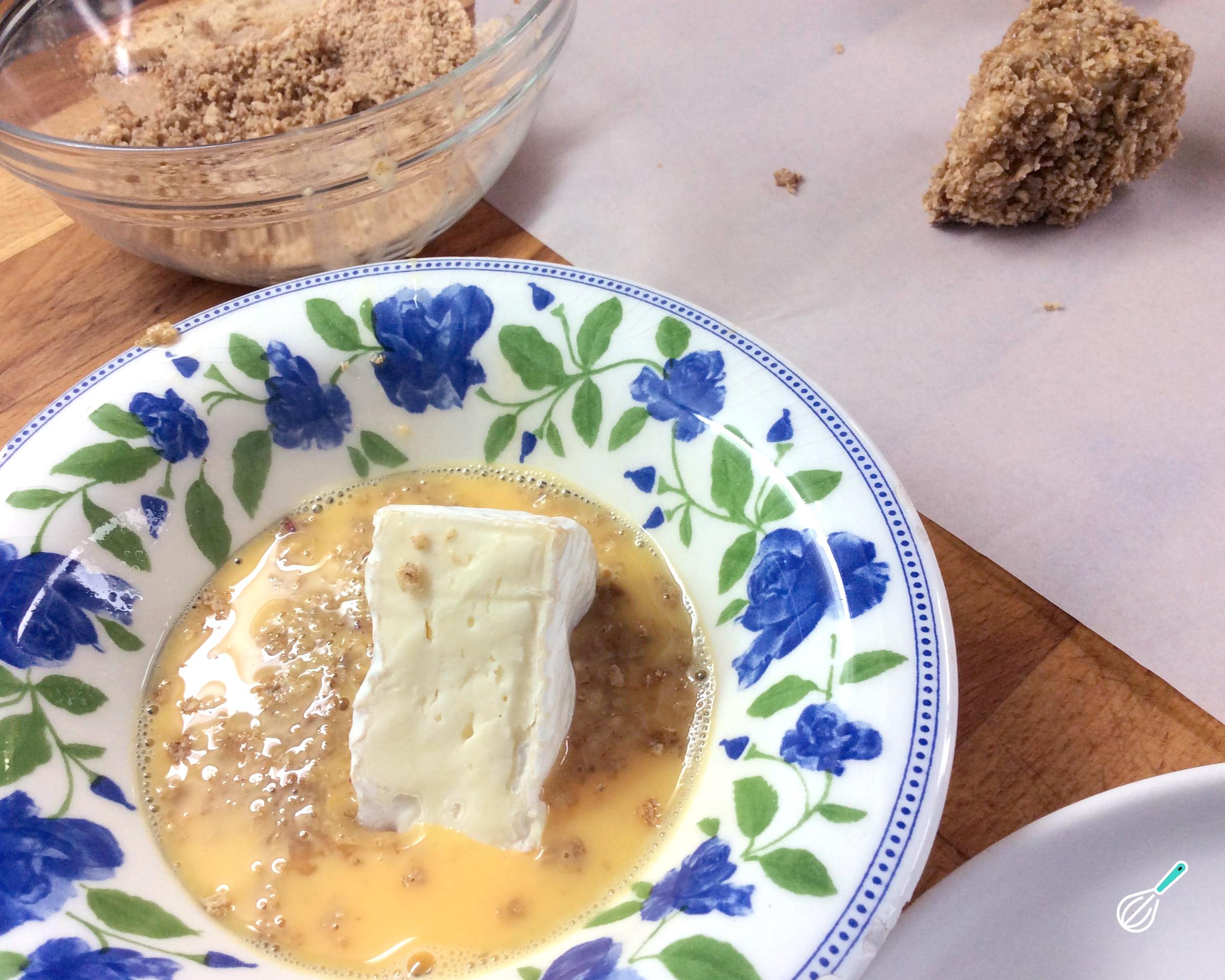 Para empanar o camembert primeiro envolva o queijo nos ovos batidos e, em seguida, nos flocos de cereais.