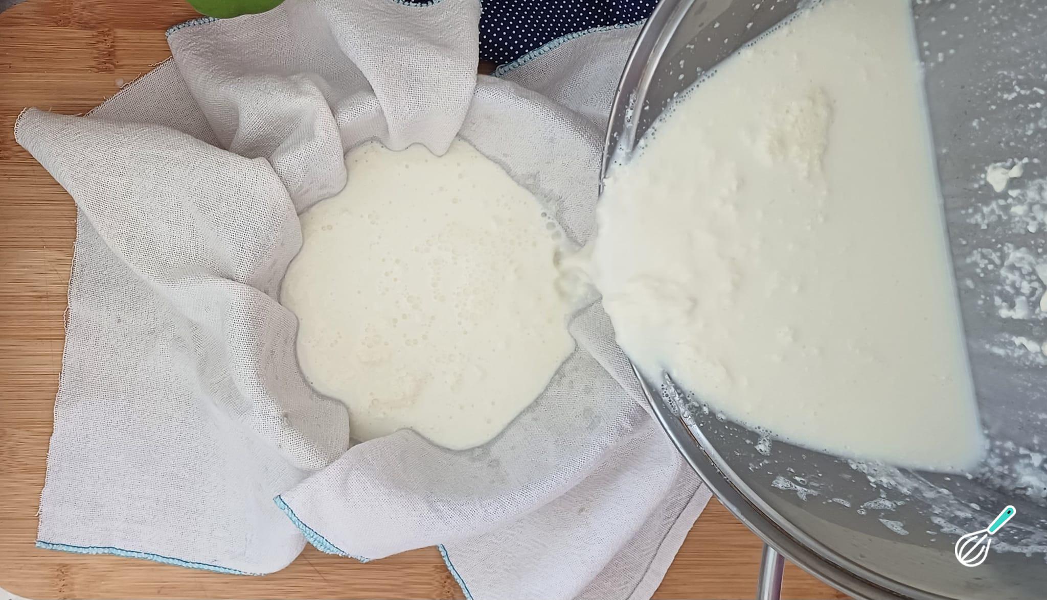 Após esse tempo, transfira o leite talhado para um pano ou peneira a fim de coá-lo para separar a massa do soro.