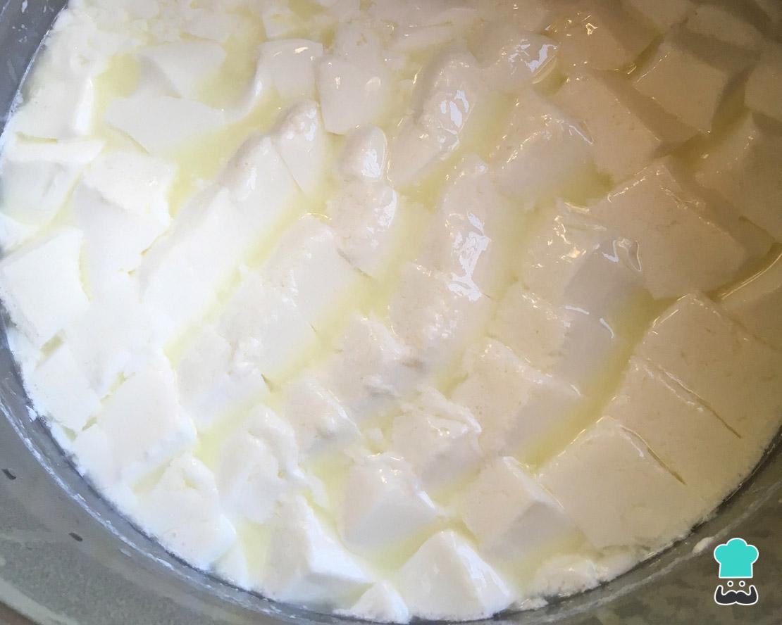 Após o tempo de repouso, corte essa massa de leite em cubos, como na foto, fazendo cortes no sentido horizontal e vertical. Leve a panela de volta ao fogo, desta vez até atingir 43° C. Retire do fogo e continue mexendo por mais 15 minutos, para que esfrie.