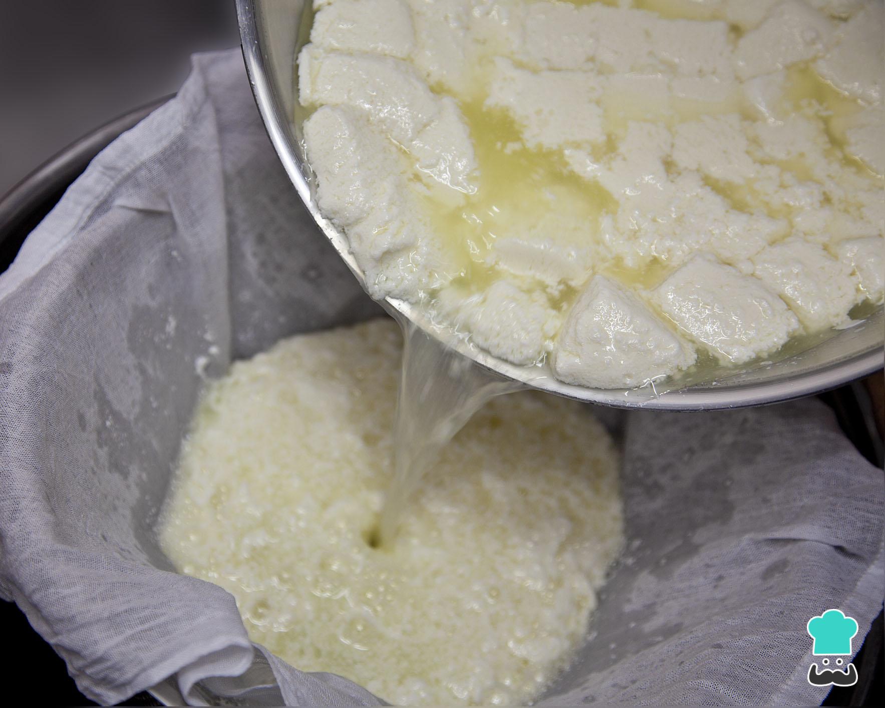 Coe essa massa de leite com a ajuda de uma peneira grande e resistente, deixando na massa apenas algum (pouco) líquido (chamado soro de leite). Acrescente o sal restante e misture com as mãos. Enrole a massa em um pano e coloque-a, ainda enrolada no pano, em uma forma com furos para queijo ou peneira grande, para escorrer o restante do líquido.