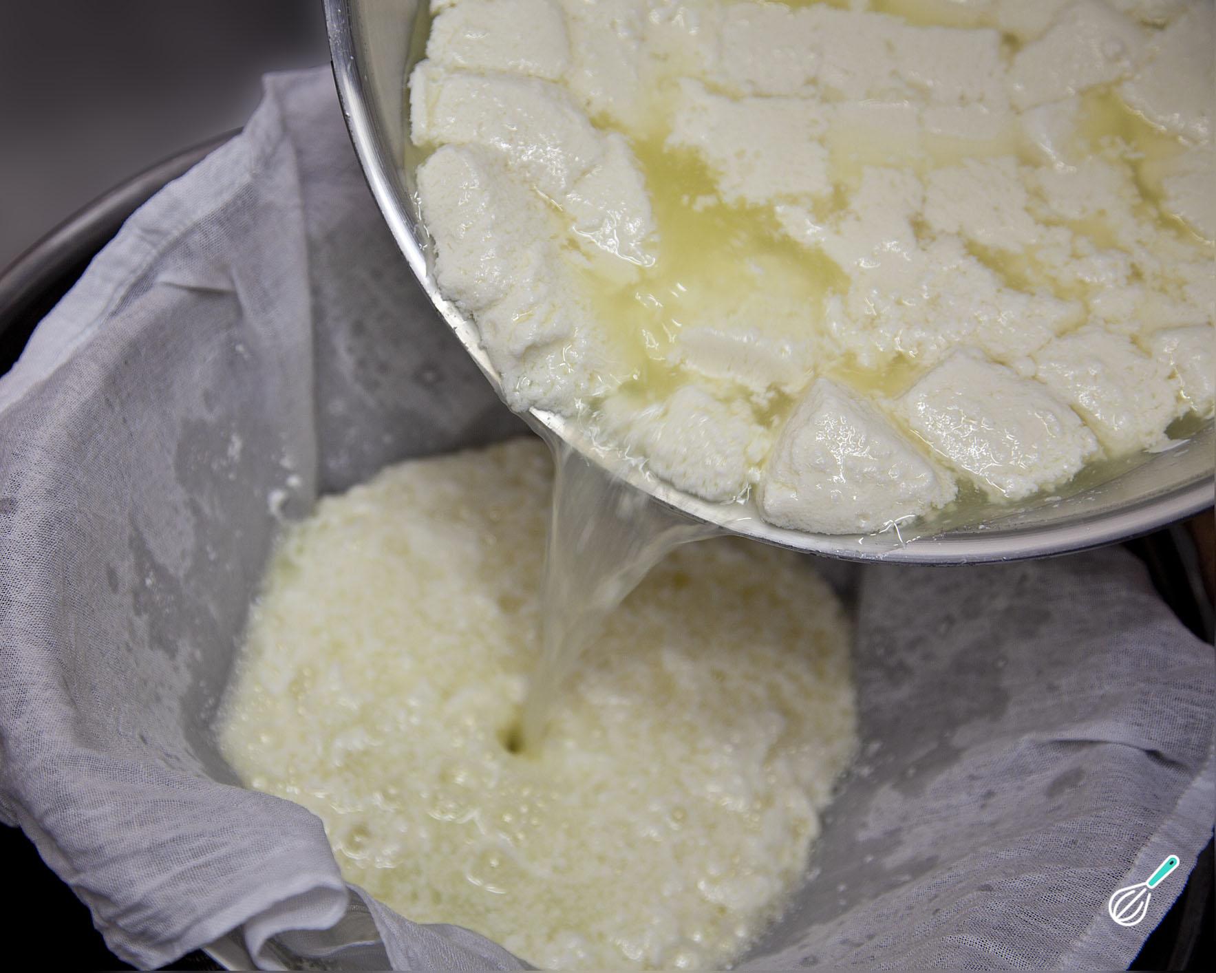 Reserve novamente por 2 minutos fora do fogo e, durante esse tempo, poderá observar que a mistura começará talhando, ou seja, separando a parte sólida da parte líquida. Coloque essa mistura numa peneira forrada com um tecido de algodão ou pano prato e uma tigela por baixo.