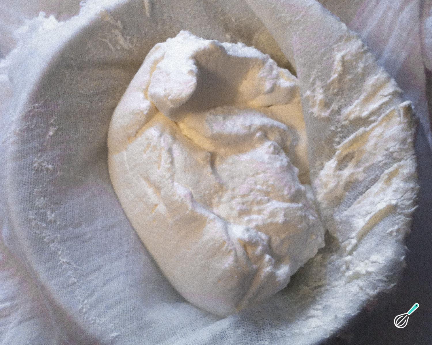 Dica: Para acelerar o processo você pode pressionar a mistura de queijo de kefir com uma colher ou torcer bem o pano.
