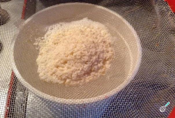Passe por uma peneira, ou uma toalha de prato branca limpa, coloque a mistura e aperte bem até sair todo o soro.