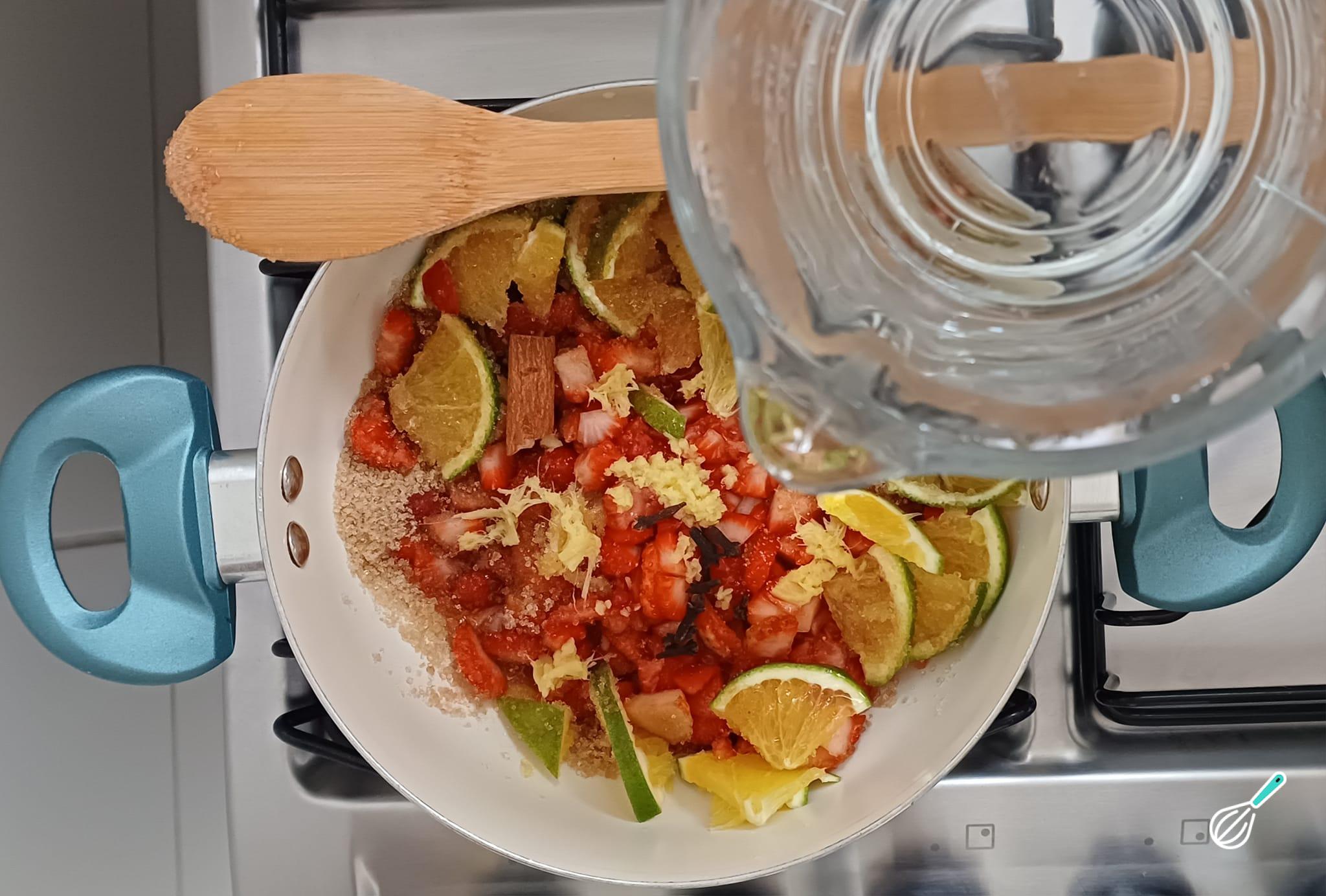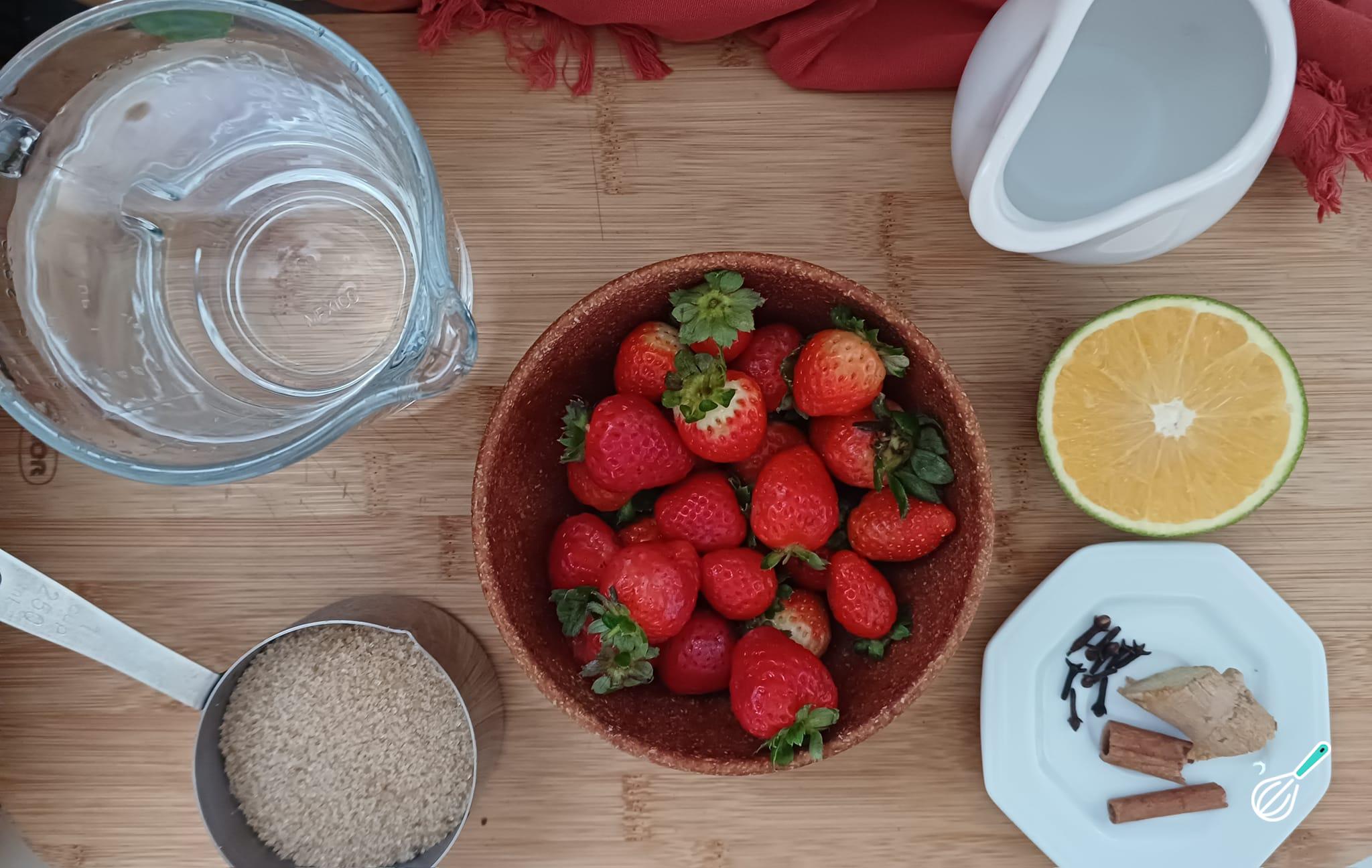 Separe todos os ingredientes necessários para preparar essa receita de quentão de morango.