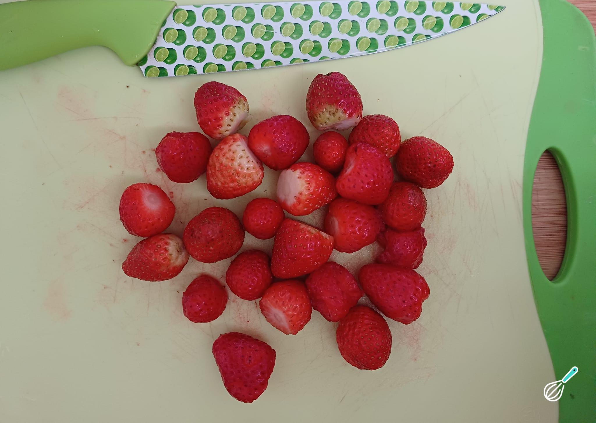 Corte os morangos em cubinhos ou rodelas e fatie finamente a laranja, mantendo sua casca.