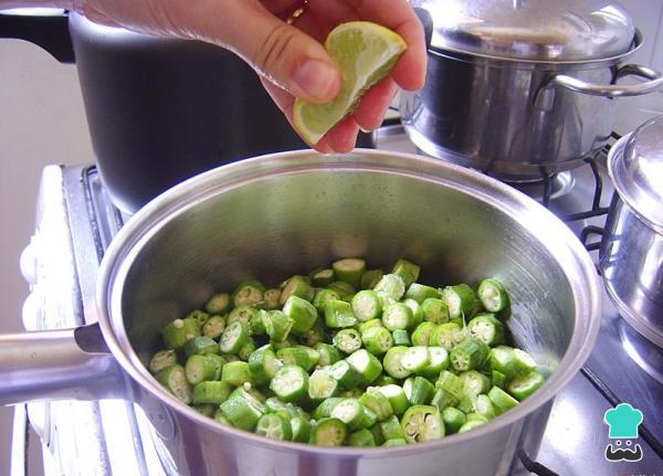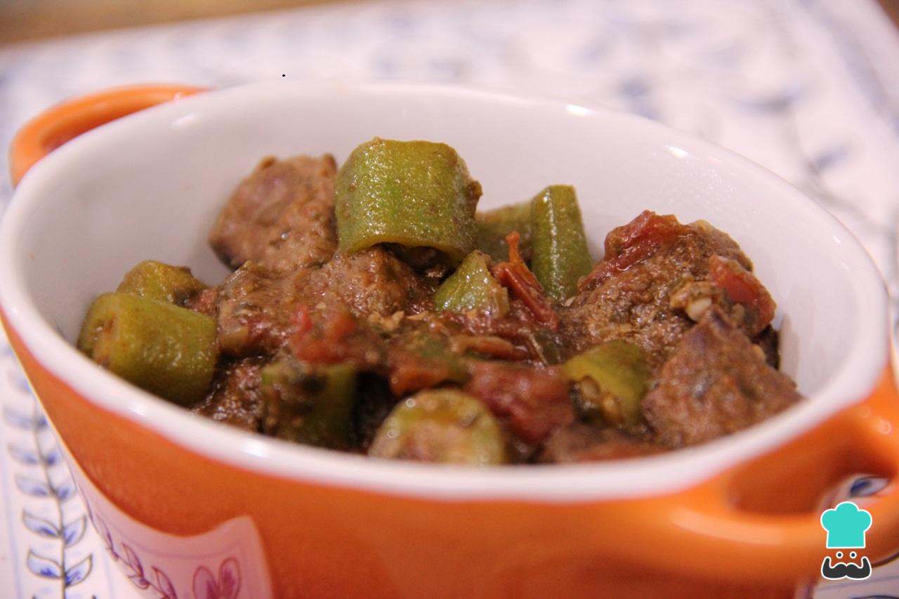 Quando a carne estiver quase pronta, junte o quiabo cortado em rodelas. Adicione a segunda metade da mistura de temperos e deixe cozinhar até o quiabo ficar macio.