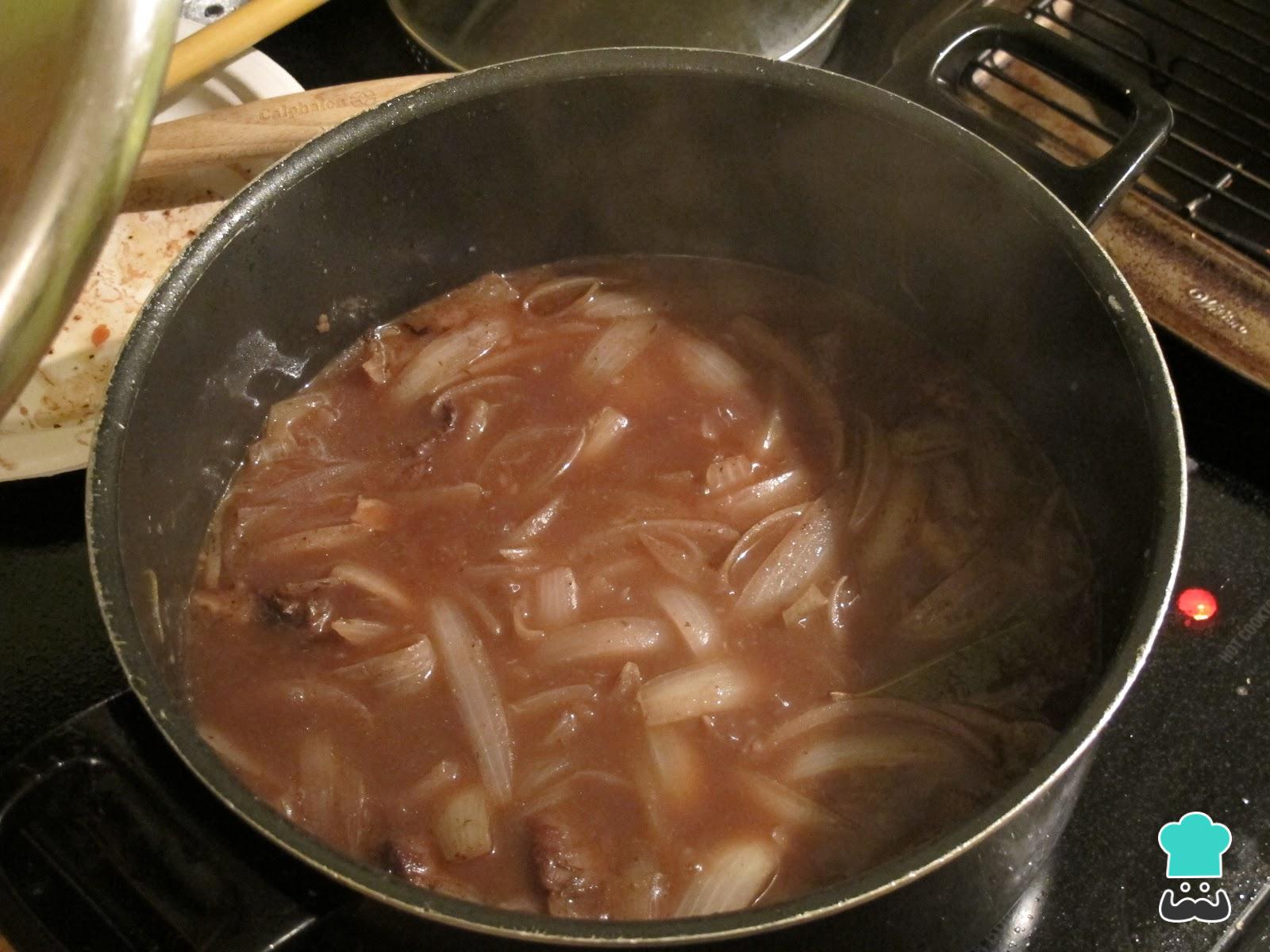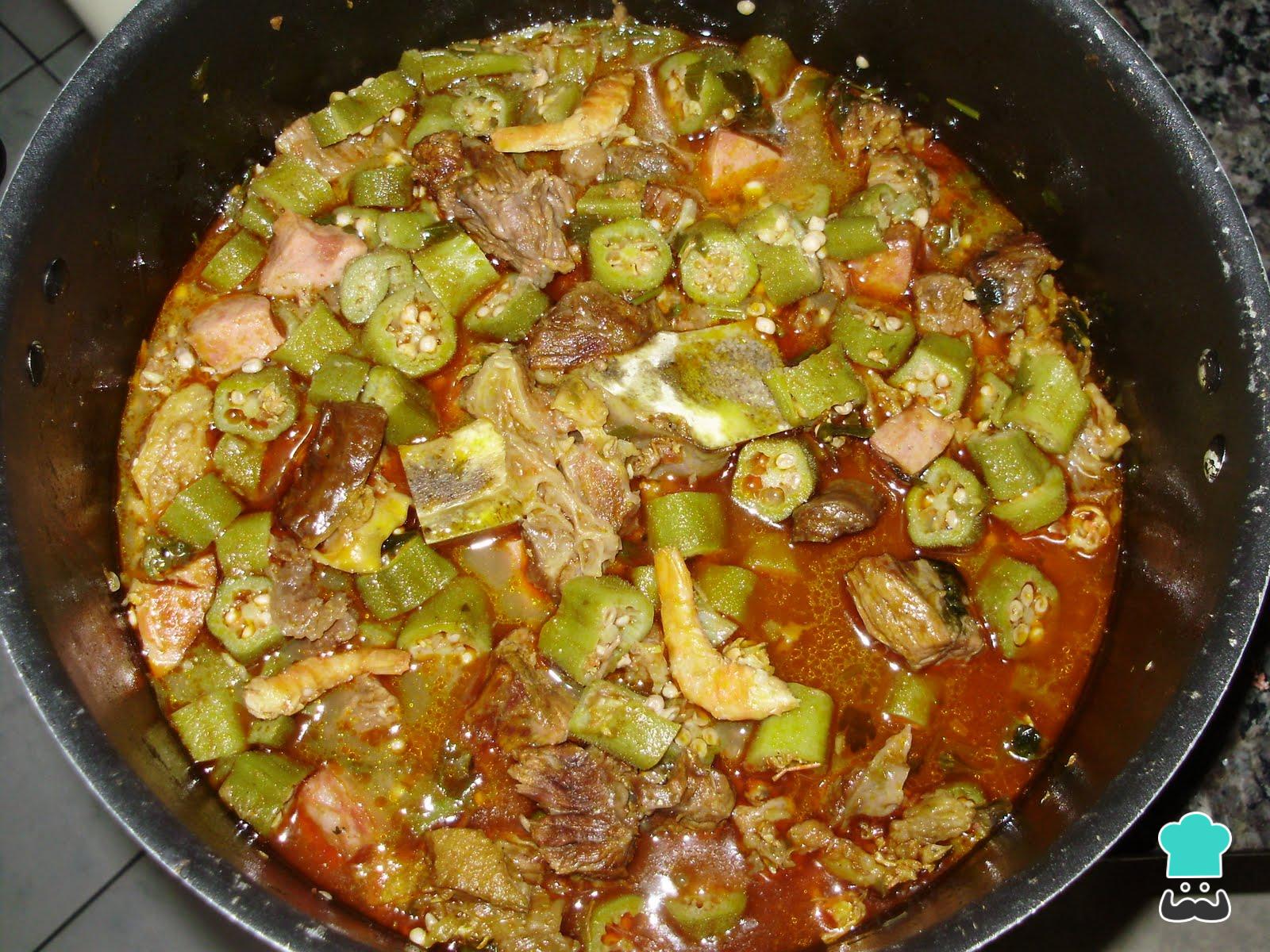 Misture todos os ingredientes (excepto o quiabo e a carne) em uma tigela e separe em duas partes. Coloque metade da mistura em uma panela com óleo quente, adicione a carne e deixe refogar por 5 minutos. Pouco a pouco, junte água e deixe a carne cozinhar.