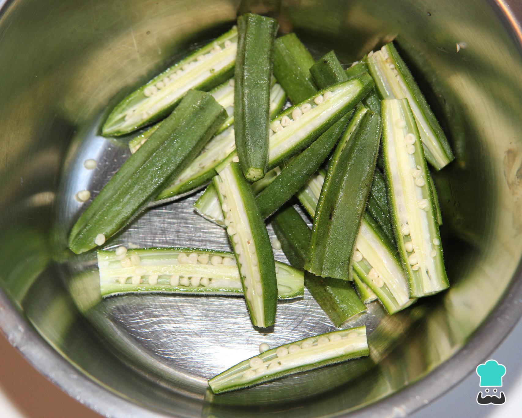 Lave e seque bem os quiabos. Corte as pontas e a seguir corte ao meio no comprimento.