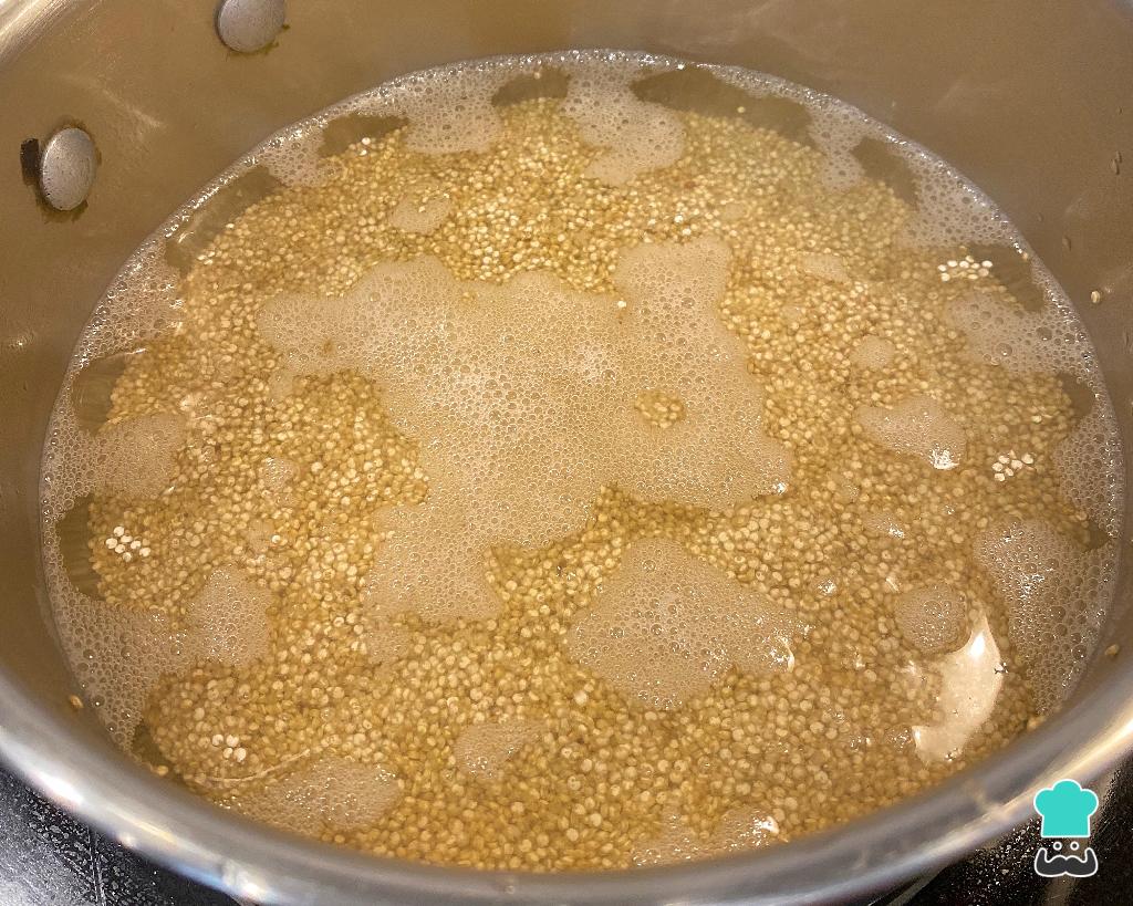 Comece seu quibe cozinhando a quinoa. Numa panela misture a quinoa com a água. Leve ao fogo médio e deixe cozinhar até a água secar, tal como se estivesse cozinhando arroz.