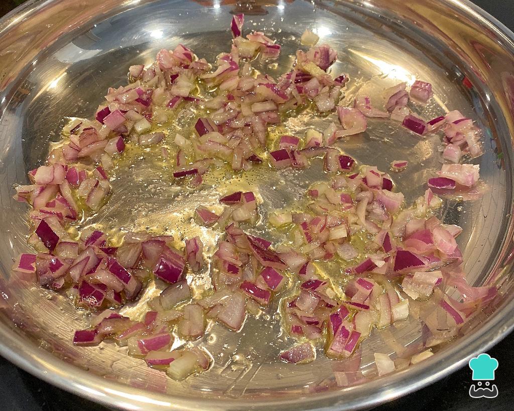 Agora faça o recheio do seu kibe vegano assado: refogue a cebola picada em uma colher de sopa de azeite, até ela ficar douradinha.