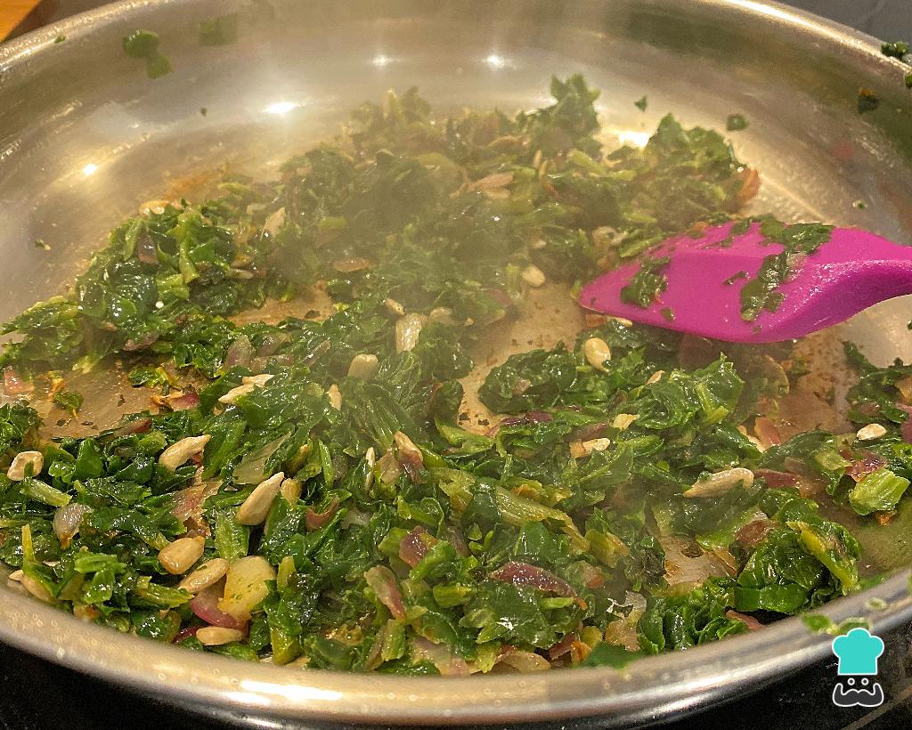 Junte o espinafre, o zaatar, o sal e as sementes de girassol. Mexa bem e refogue por 2 minutos. Desligue o fogo e espere esfriar um pouco antes de avançar para o passo seguinte.