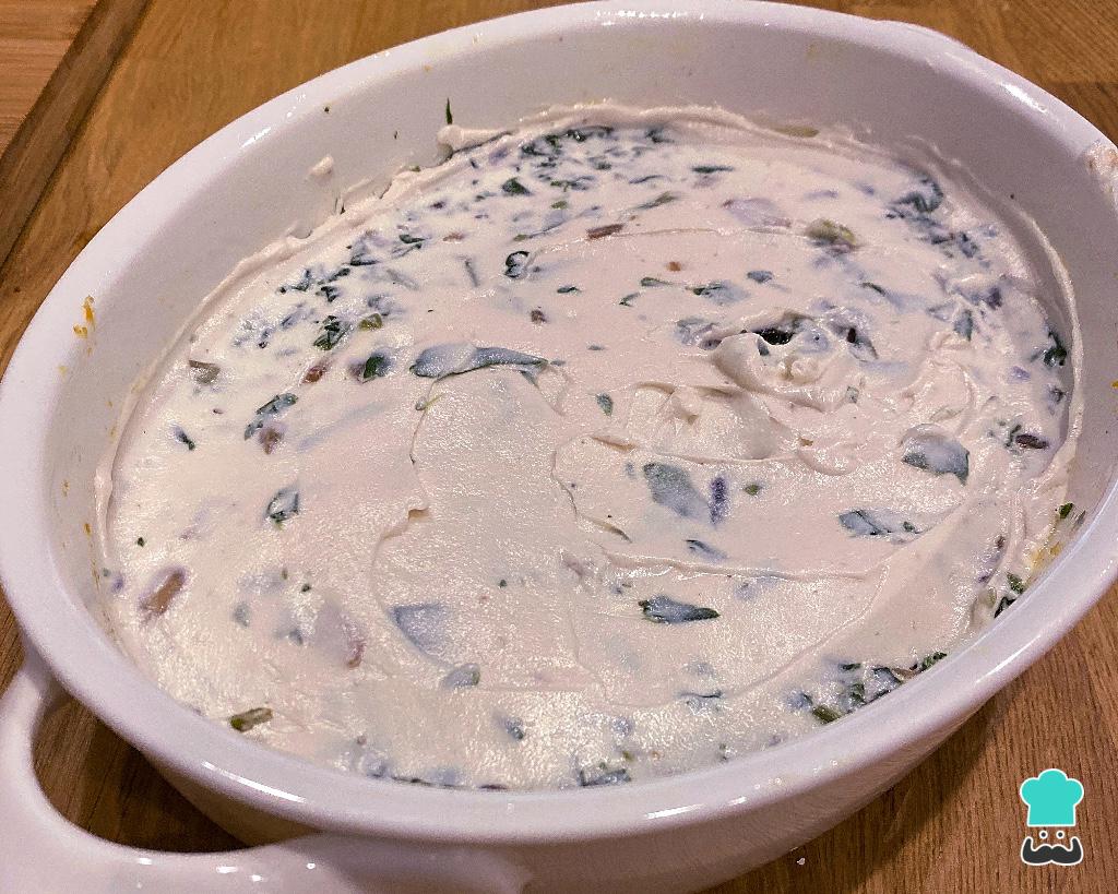 Divida a massa do quibe em 2 partes. Coloque uma parte no fundo da travessa e aperte bem, por cima coloque o espinafre e o cream cheese vegano (opcional).