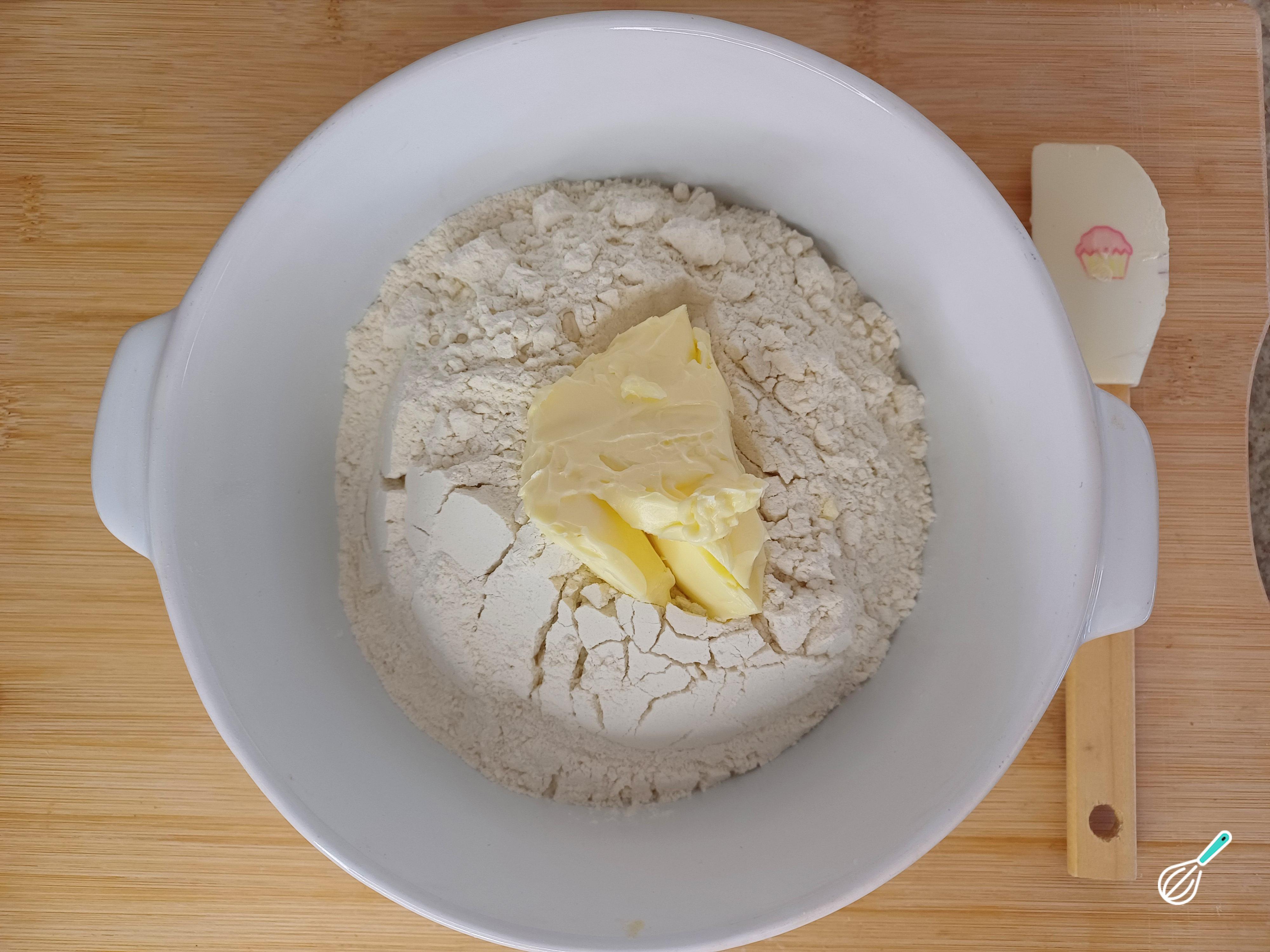 Em uma tigela, faça a massa colocando a farinha de trigo peneirada, o sal e a manteiga gelada no centro. Misture bem com as pontas do dedo, até virar uma farofa úmida.