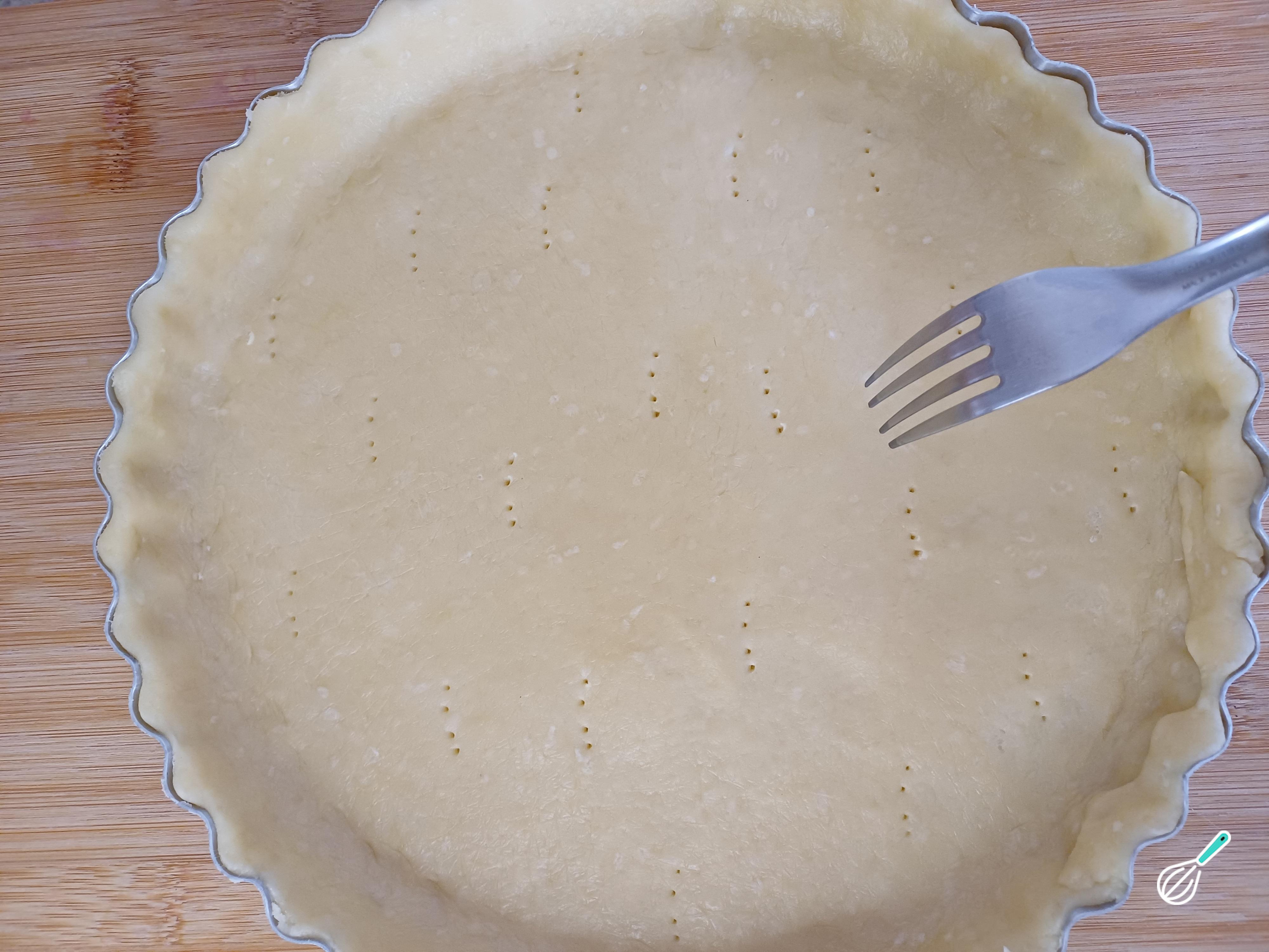 Cubra a forma de aro removível com a massa, aperte bem e retire o excesso das bordas. Fure todo o fundo da massa com as pontas de um garfo e leve ao forno pre-aquecido a 180º por 20 minutos.