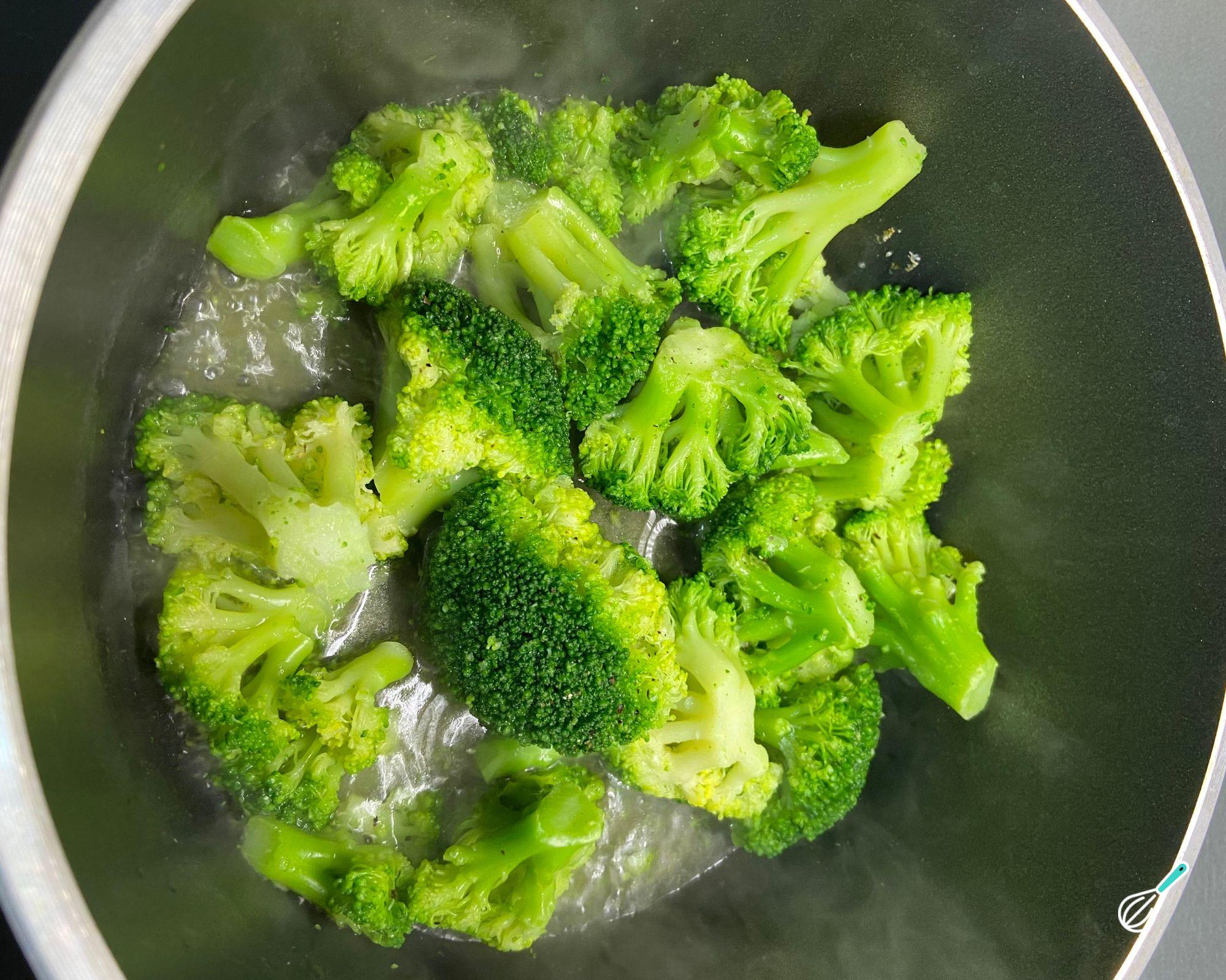 Coloque o brócolis em uma panela grande, com um fio de azeite, em fogo médio e cozinhe até você espetar ele com um garfo e estar molinho.