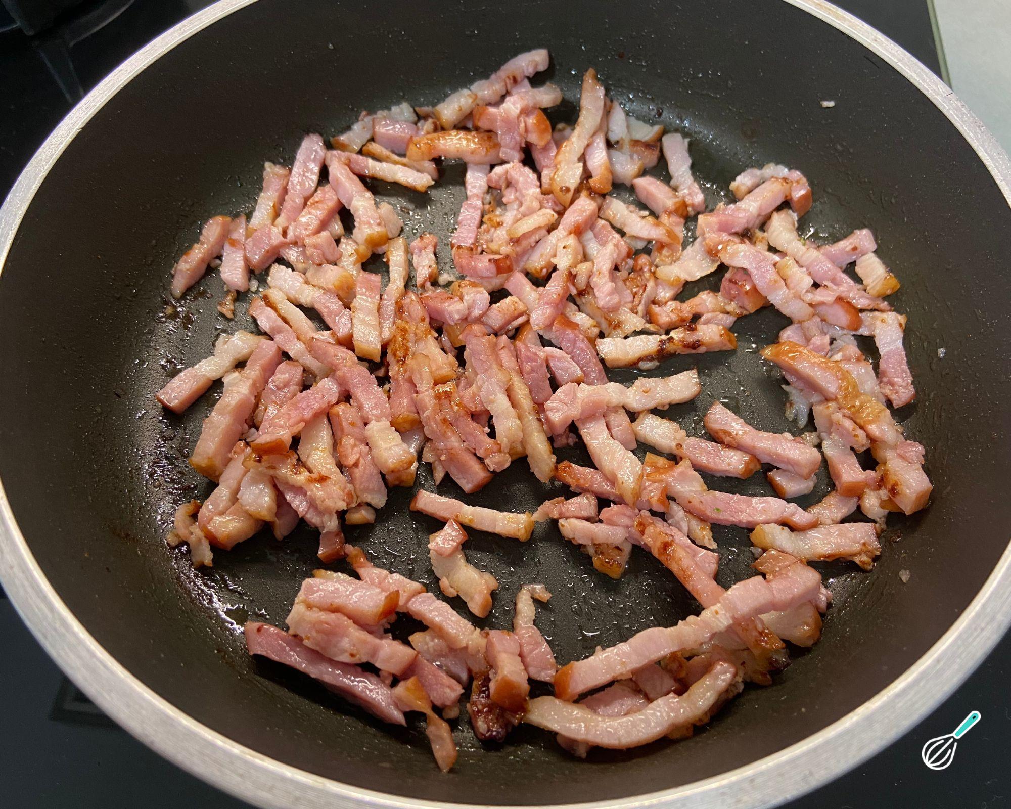 Em outra panela, coloque o bacon picado, e refogue até ficar dourado.