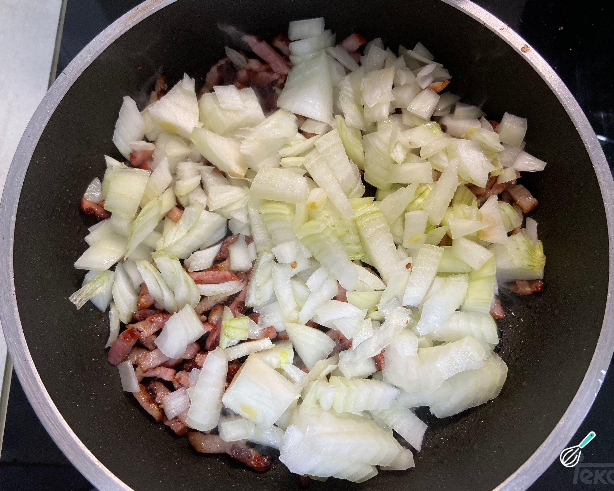 Quando o bacon estiver dourado, na mesma panela coloque a cebola e refogue por 3 minutos.