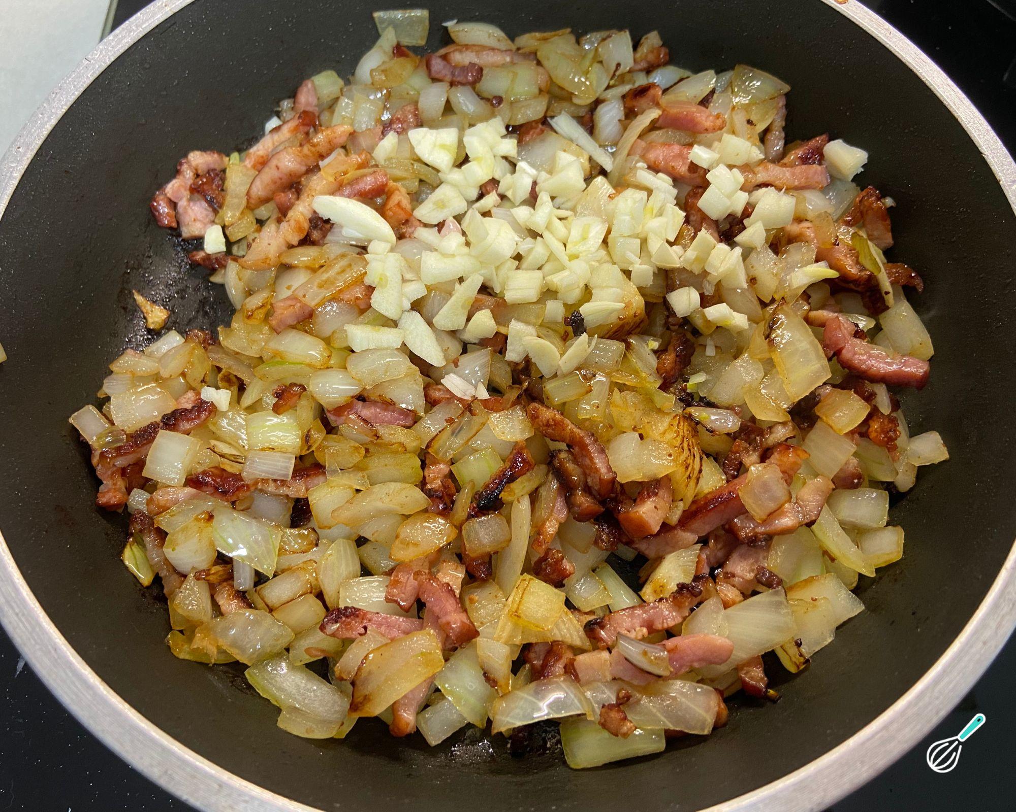 Quando o bacon e a cebola estiverem quase prontos, acrescente o alho picado e refogue por 3 minutos e reserve.