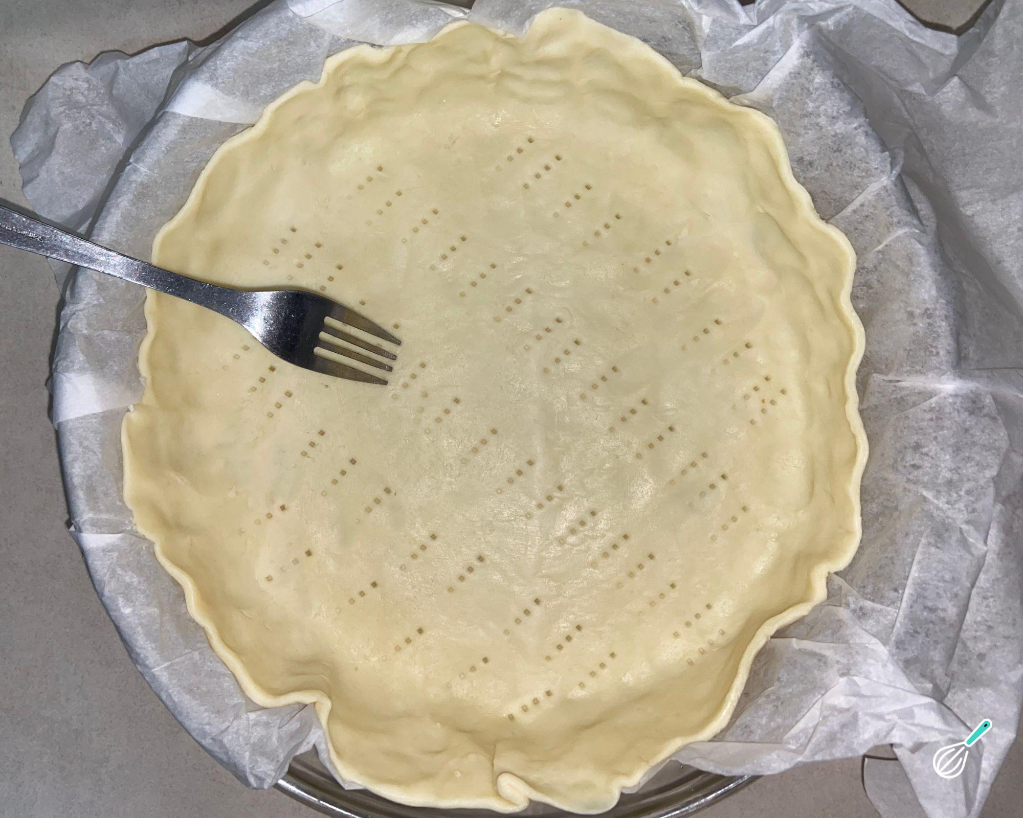 Coloque em uma forma a massa para o quiche e fure o fundo com um garfo para a massa não quebrar.