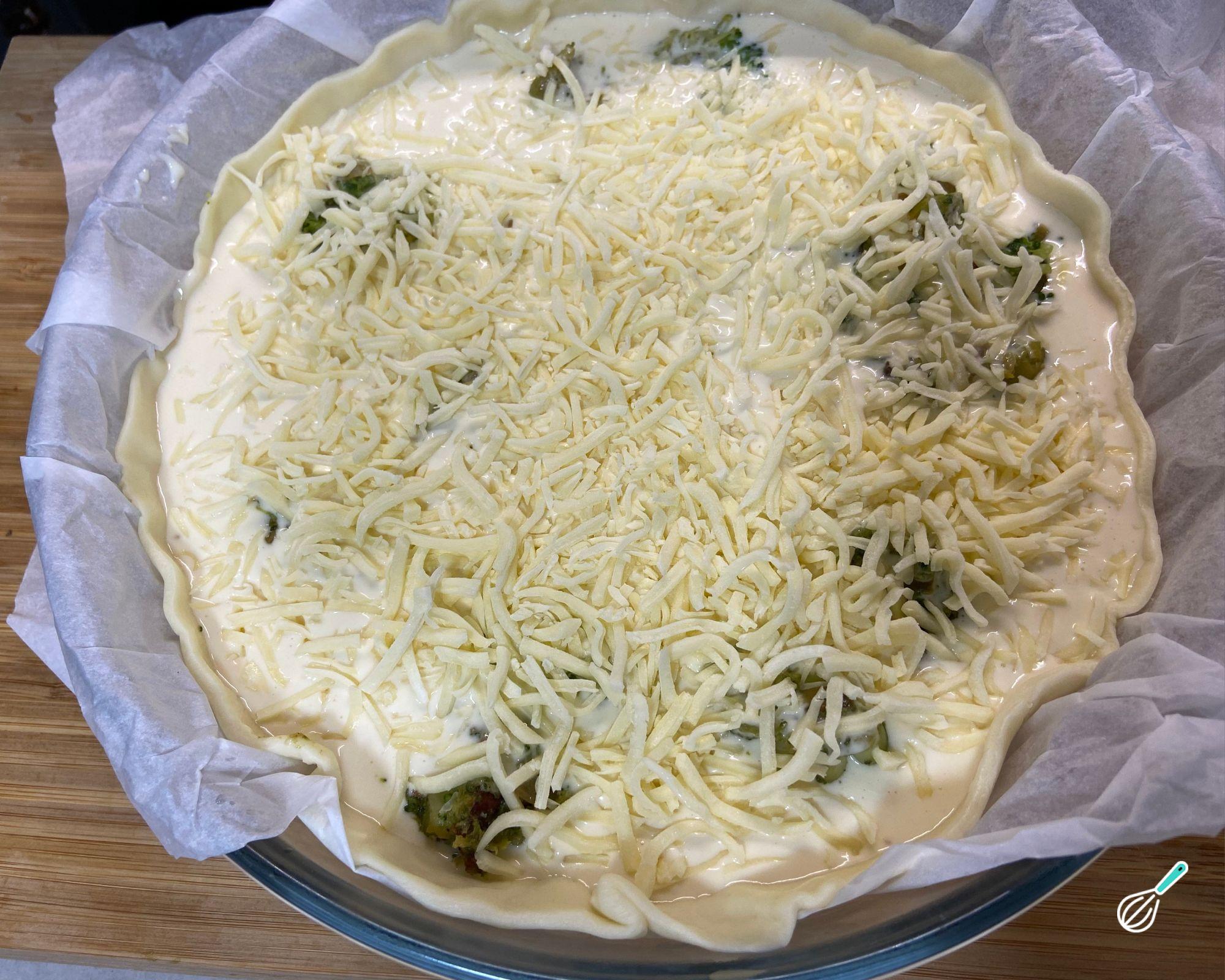 Coloque o recheio de brócolis e bacon na massa e acrescente a mistura de creme de leite e ovo, finalize com o queijo ralado por cima.