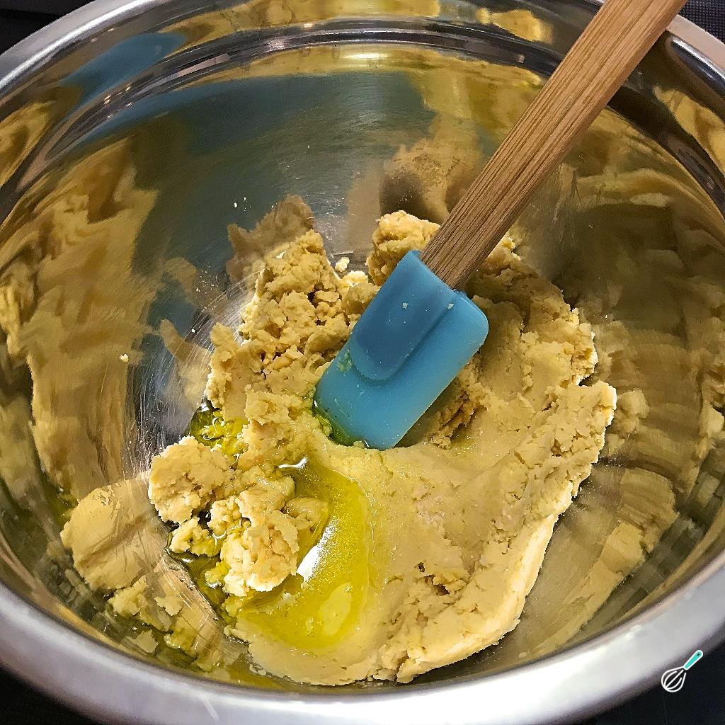Comece fazendo a massa de grão de bico batendo o grão de bico no liquidificador ou em um processador até obter uma pasta lisa. Coloque num bowl, acrescente o azeite e misture.