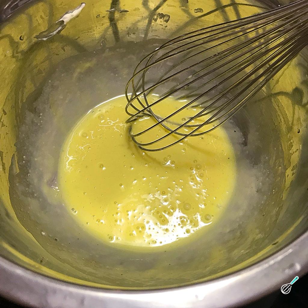 Agora avance para o recheio desta quiche de brócolis com massa de grão de bico: numa vasilha misture o ovo com o cream cheese e tempere com sal e pimenta.