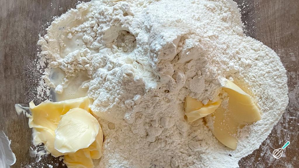 Numa tigela, coloque a farinha, a manteiga, a água e 1 colher de chá de sal.
