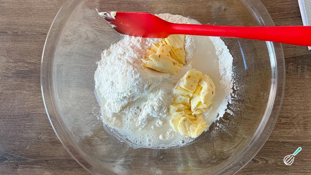 Numa tigela, misture a farinha de trigo, a margarina ou manteiga e a água.