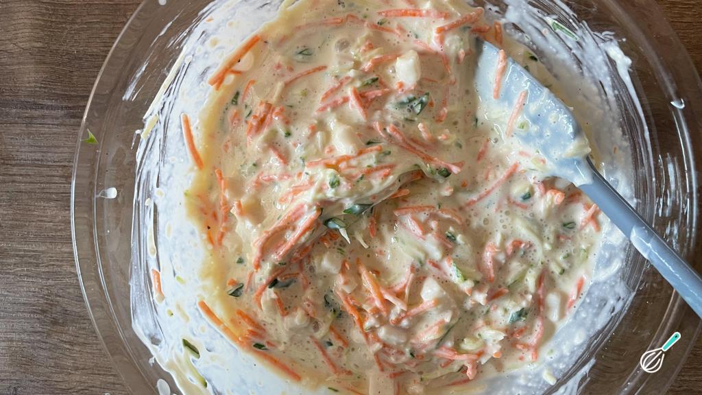 Misture todos os ingredientes do recheio: os ovos, a cenoura, a abobrinha, o palmito, o queijo, o iogurte, o creme de ricota, o sal, a pimenta do reino e a cebolinha.