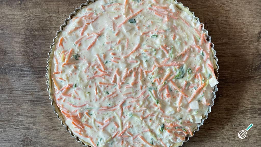 Despeje o recheio sobre a massa e leve para assar no forno preaquecido a 200 graus por 45 minutos ou até a quiche ficar dourada.