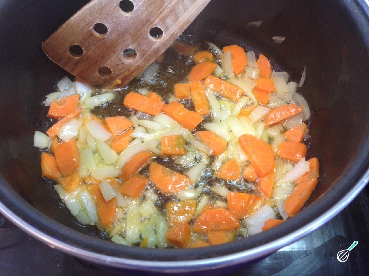 Comece pelos vegetais: lave-os e corte-os em cubos pequenos. Em uma panela aqueça um pouco de óleo e refogue a cebola e cenoura em primeiro lugar.