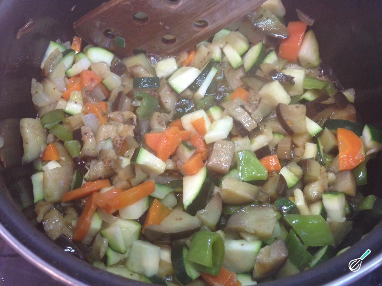 Quando a cebola começar a dourar, adicione os restantes legumes: a berinjela, a abobrinha e o pimentão, adicionando um pouco mais de óleo se necessário. Cozinhe em fogo médio pelo menos durante 10-15 minutos, mexendo ocasionalmente, até que os legumes estejam macios.
