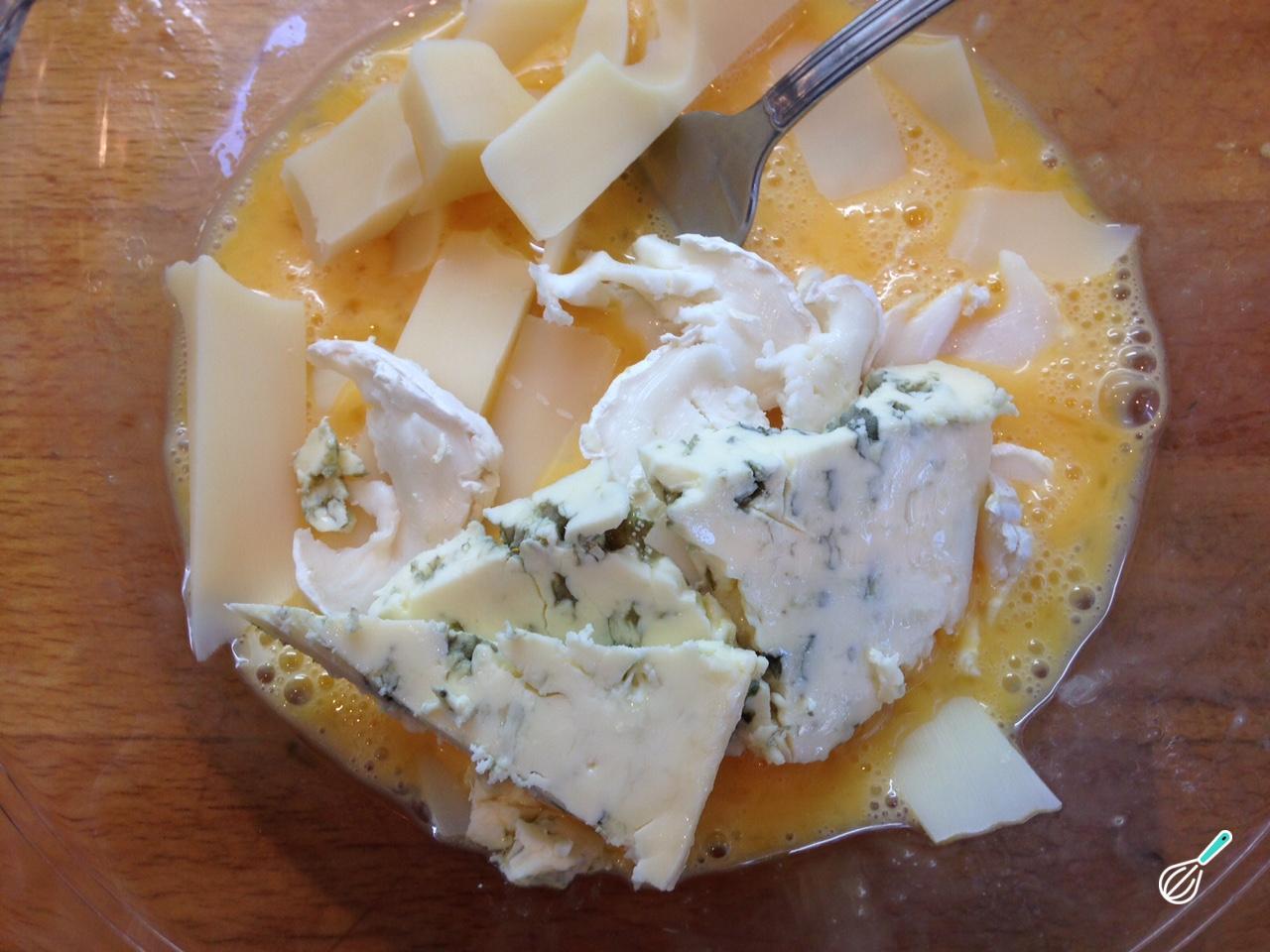 Em uma tigela grande bata os ovos. Depois adicione os queijos cortados em pedaços e o creme de leite, e envolva bem.
