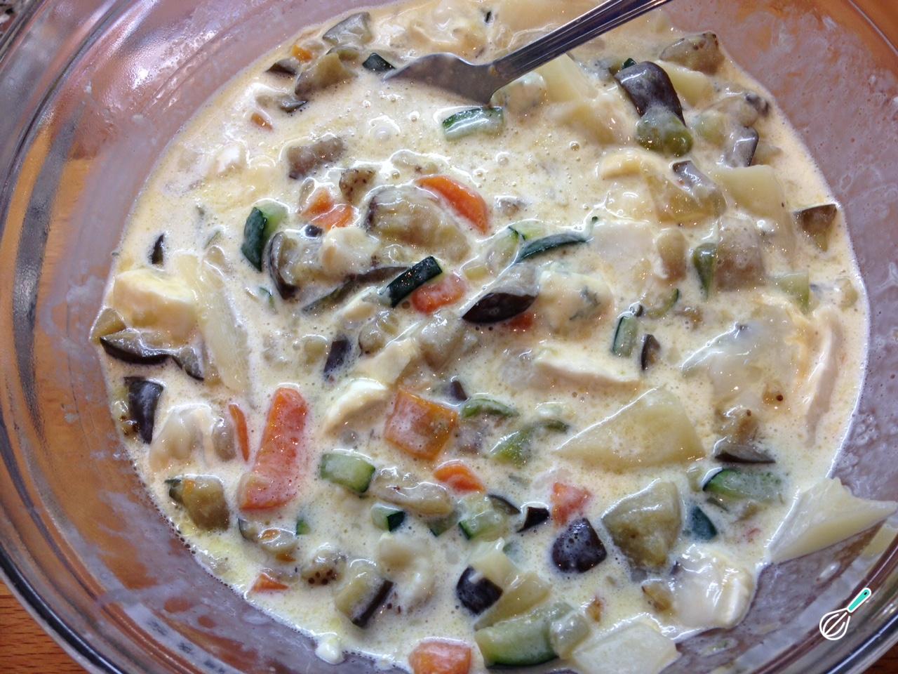 Quando os legumes já estiverem prontos, escorra o excesso de líquido que possam ter libertado, e deixe amornar. Depois adicione-os à tigela que contém os ovos e os queijos, tempere com sal e misture: este será o recheio da quiche.
