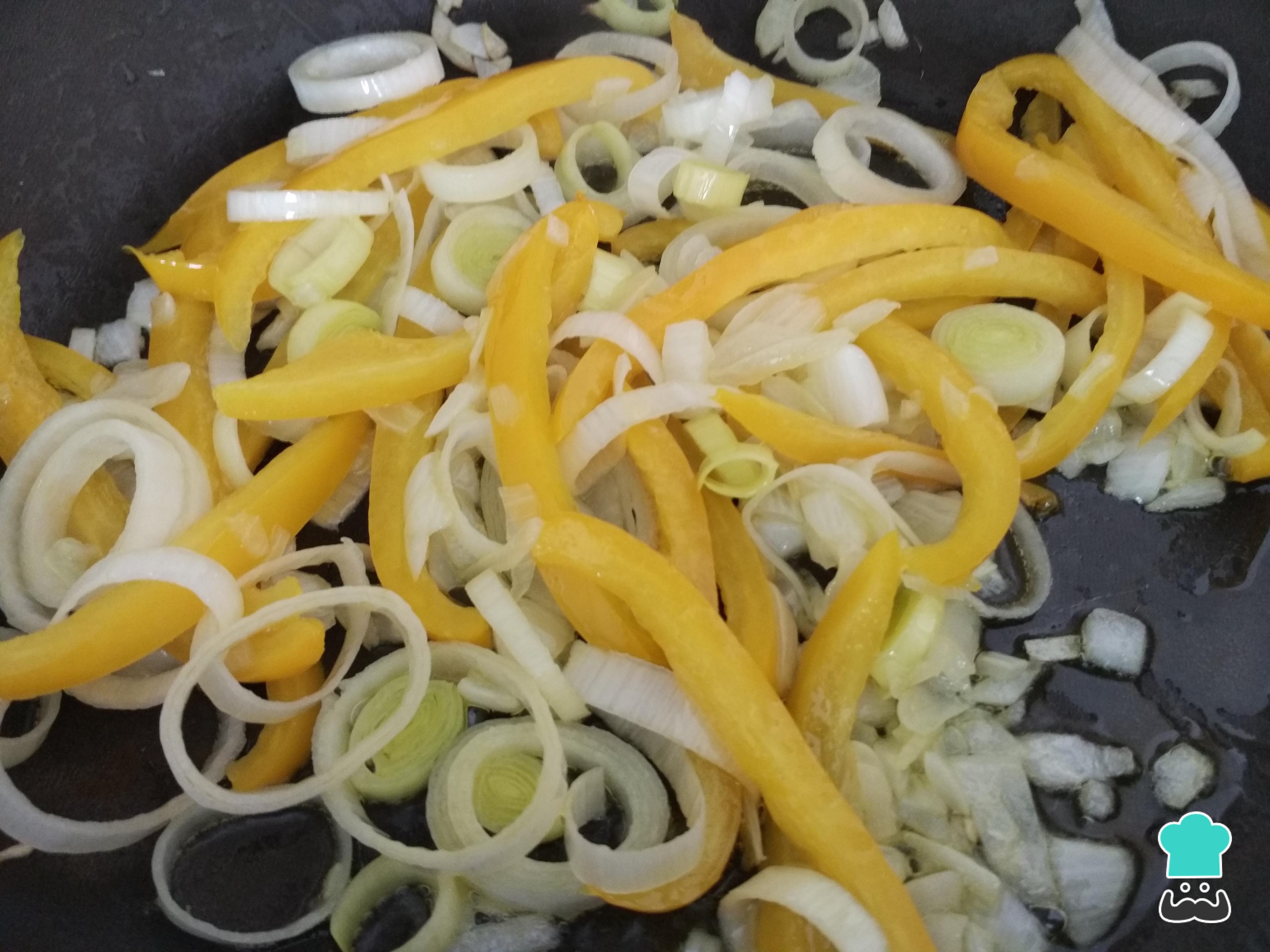 Refogue a cebola cortada em pedaços pequenos com o pimento amarelo cortado em tiras. Deixe cozinhar em fogo médio por 4 minutos. Adicione o alho-poró cortado em rodelas ao molho e deixe cozinhar por mais alguns minutos. Tempere com sal e pimenta-do-reino.
