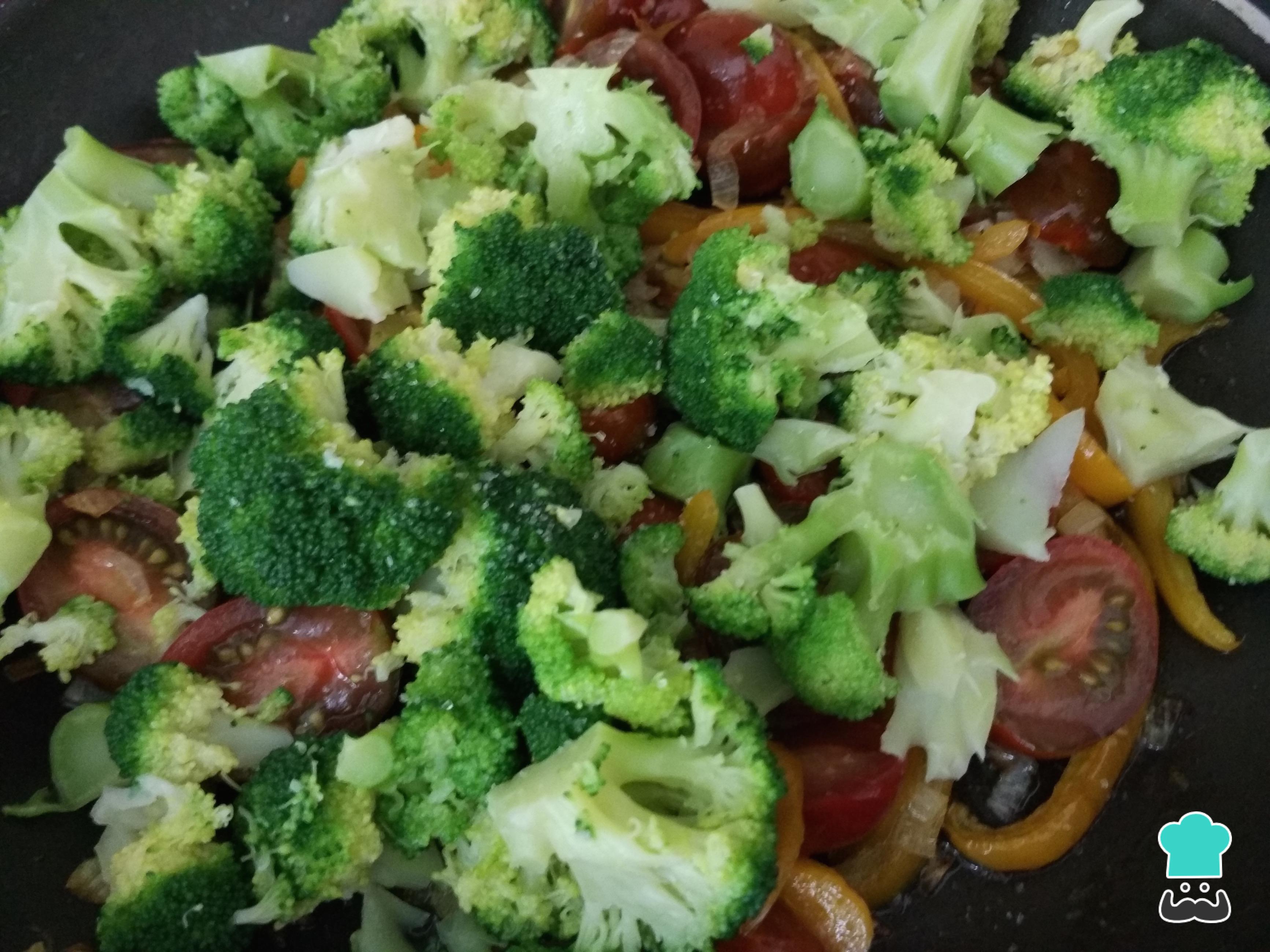 Acrescente os tomates cereja cortados ao meio na panela, junto com os brócolis. Coloque um pouco de sal e pimenta e misture com o conteúdo da frigideira.