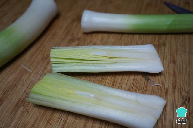 Lave bem o alho poró e corte separe a parte branca dele, como na foto. Corte na metade e depois em fatias.