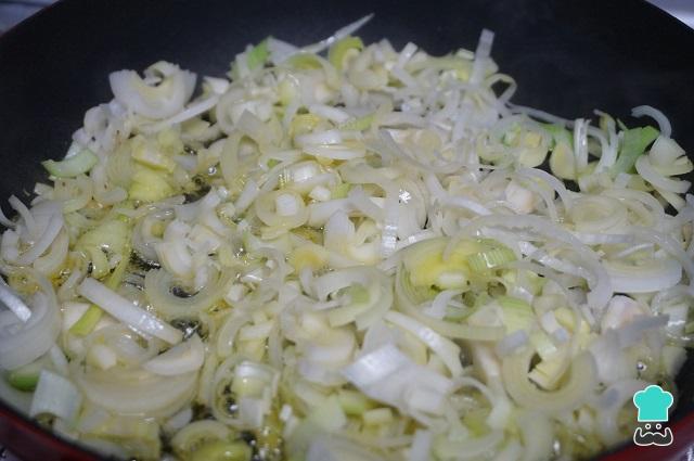 Leve ao fogo médio uma frigideira ou panela com um fio de azeite e refogue o alho poró. Mexa de vez em quando, para que o alho poró cozinhe mais depressa e sem queimar.