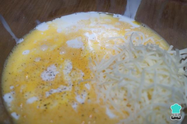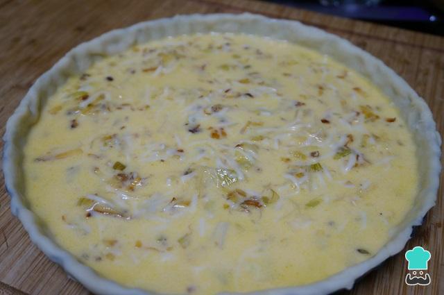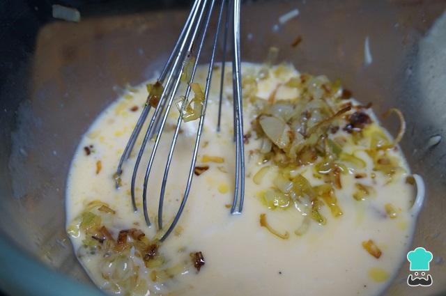 Quando o alho poró estiver macio, misture com o creme de ovos, creme de leite e queijo. Pré-aqueça o forno nos 200ºC.