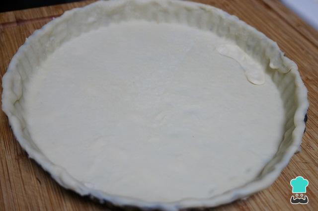 Coloque a massa numa forma de torta com fundo amovível e corte o excesso das laterais. Se preferir, pode preparar uma massa podre caseira.
