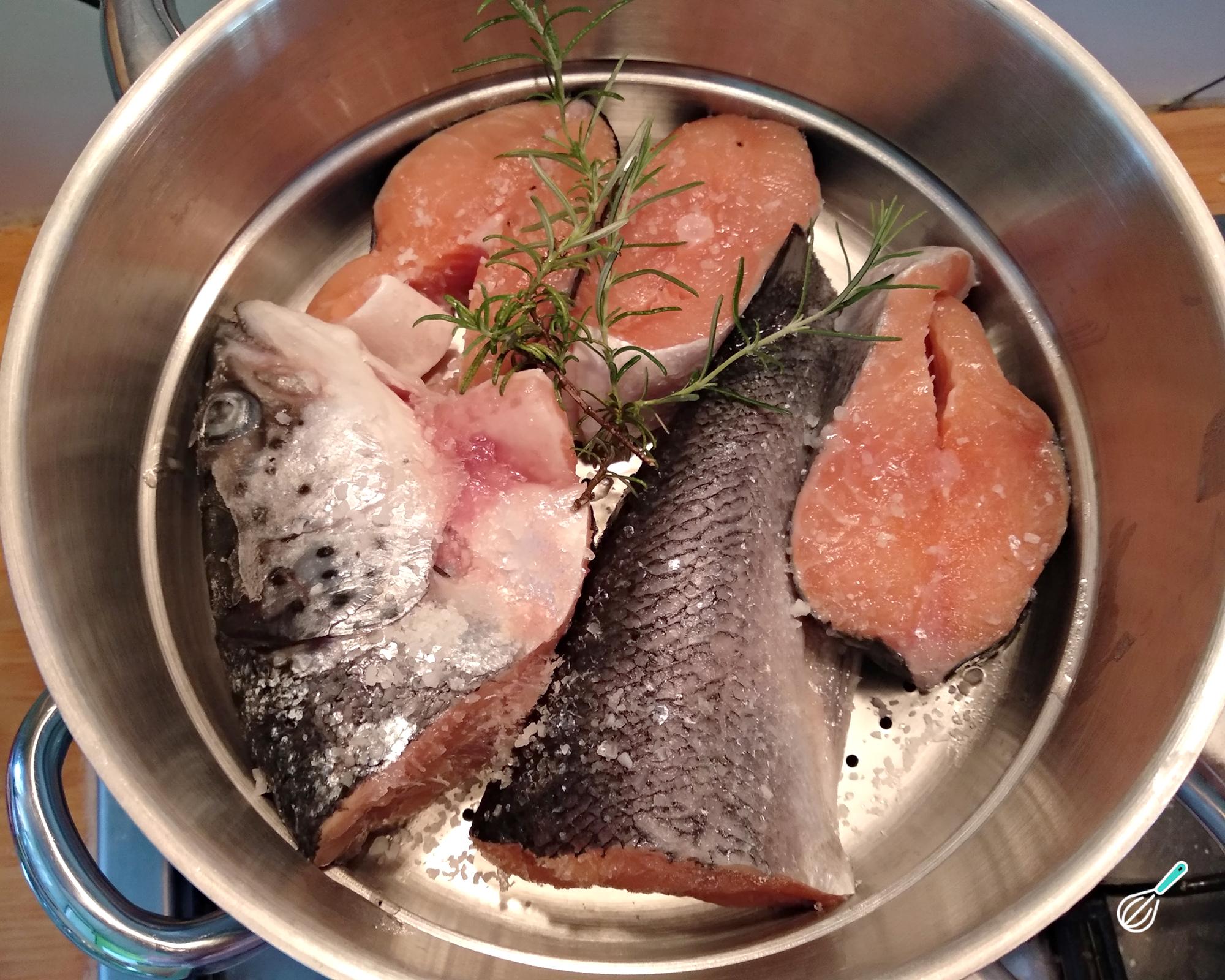 O primeiro passo do preparo desta receita de quiche é cozinhar o salmão. De forma a manter as propriedades e evitar que fique úmido (para não soltar água na quiche) aconselho cozinhar o salmão no vapor. Tempere com um pouco de sal e alecrim e conte 20-30 minutos de cozedura.