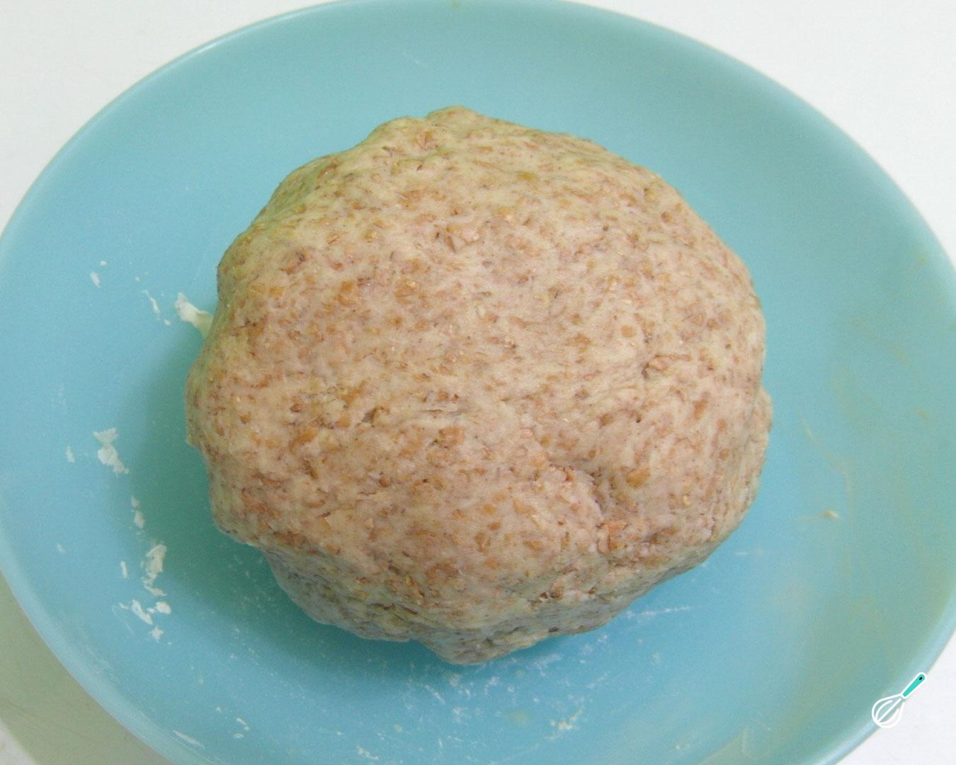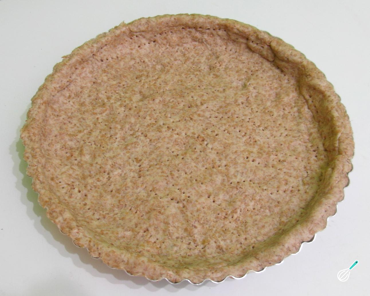 Enquanto isso prepare a massa da quiche integral: coloque em uma tigela, num processador ou robot de cozinha a farinha, a manteiga, a água e o sal. Bata até virar uma bola de massa que desgruda, modele em forma de bola e reserve na geladeira por 20 minutos.