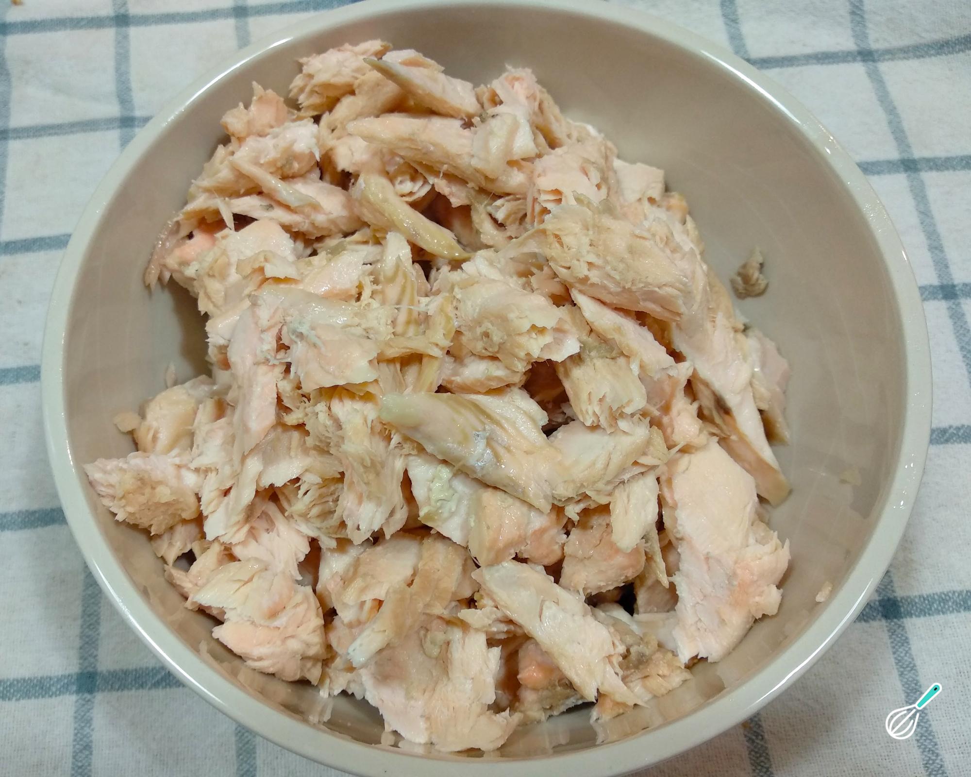 Continue preparando esta receita de quiche de salmão com alho poró: quando o salmão estiver cozinhado, separe a pele e as espinhas e desfie em pedaços grandes.