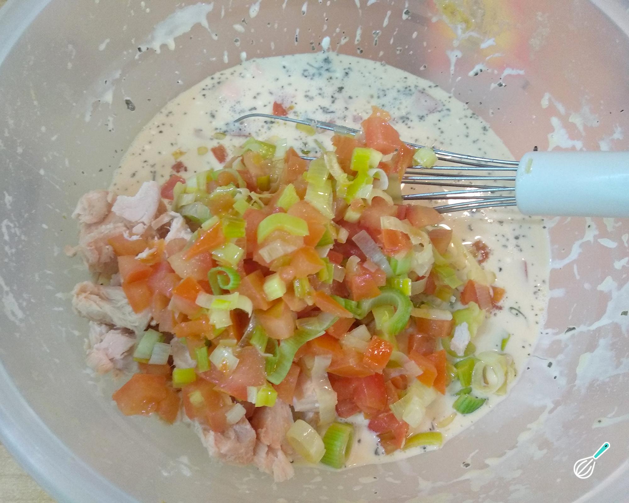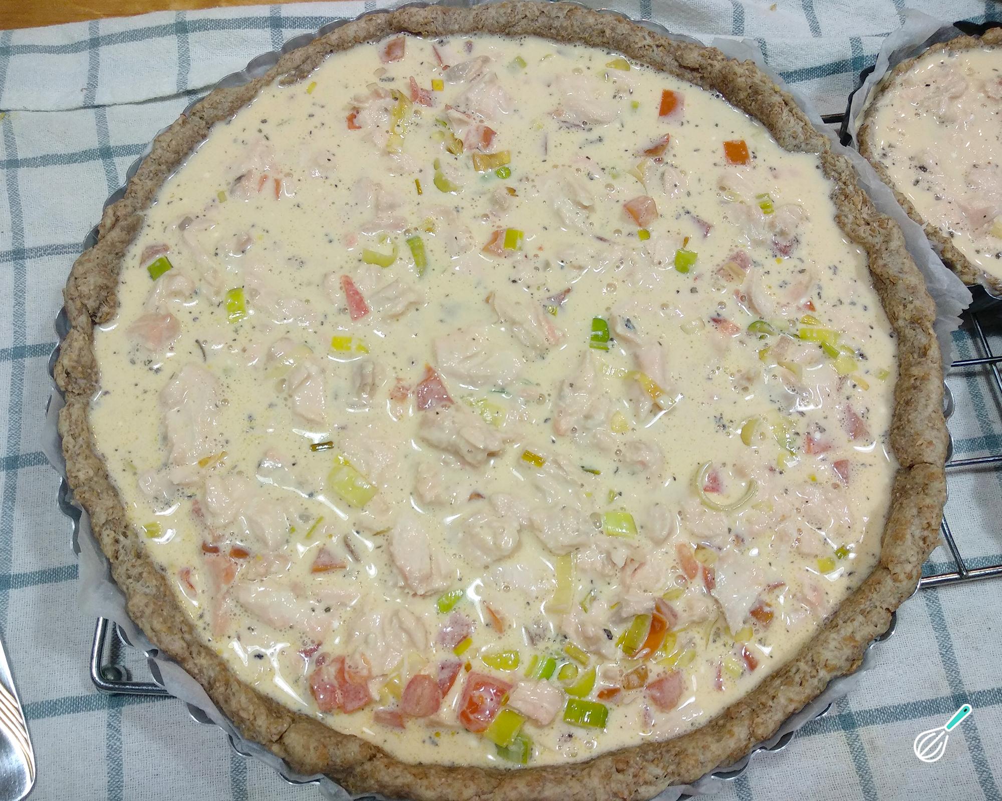 Finalmente termine de preparar o recheio desta quiche caseira: numa tigela bata os ovos com o creme de leite, tempere com sal e pimenta a gosto e adicione o salmão e o refogado. Misture tudo delicadamente, para evitar desfazer o salmão.
