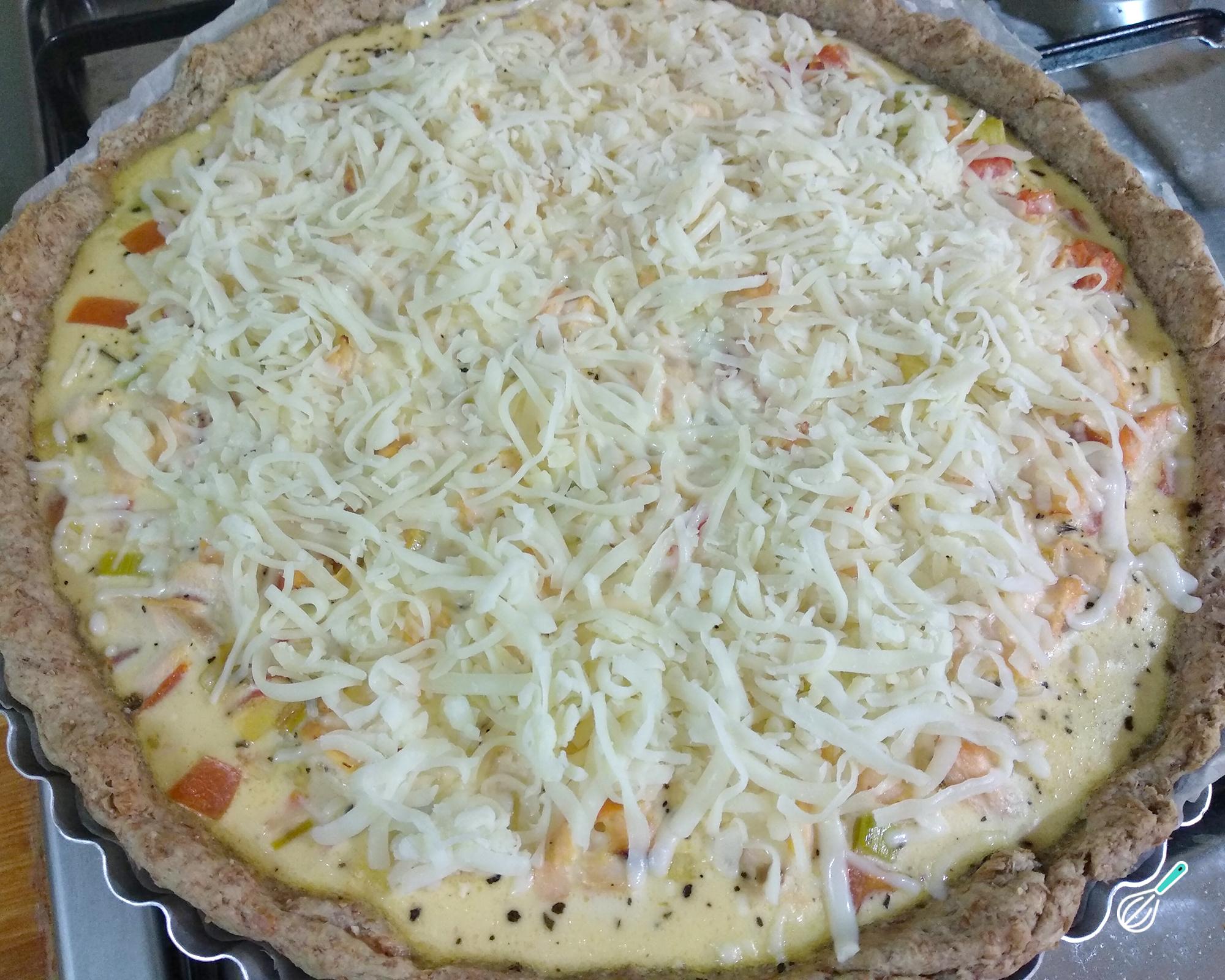 Quando a quiche estiver assada, junte o queijo ralado e leve de novo ao forno até o queijo derreter e dourar.