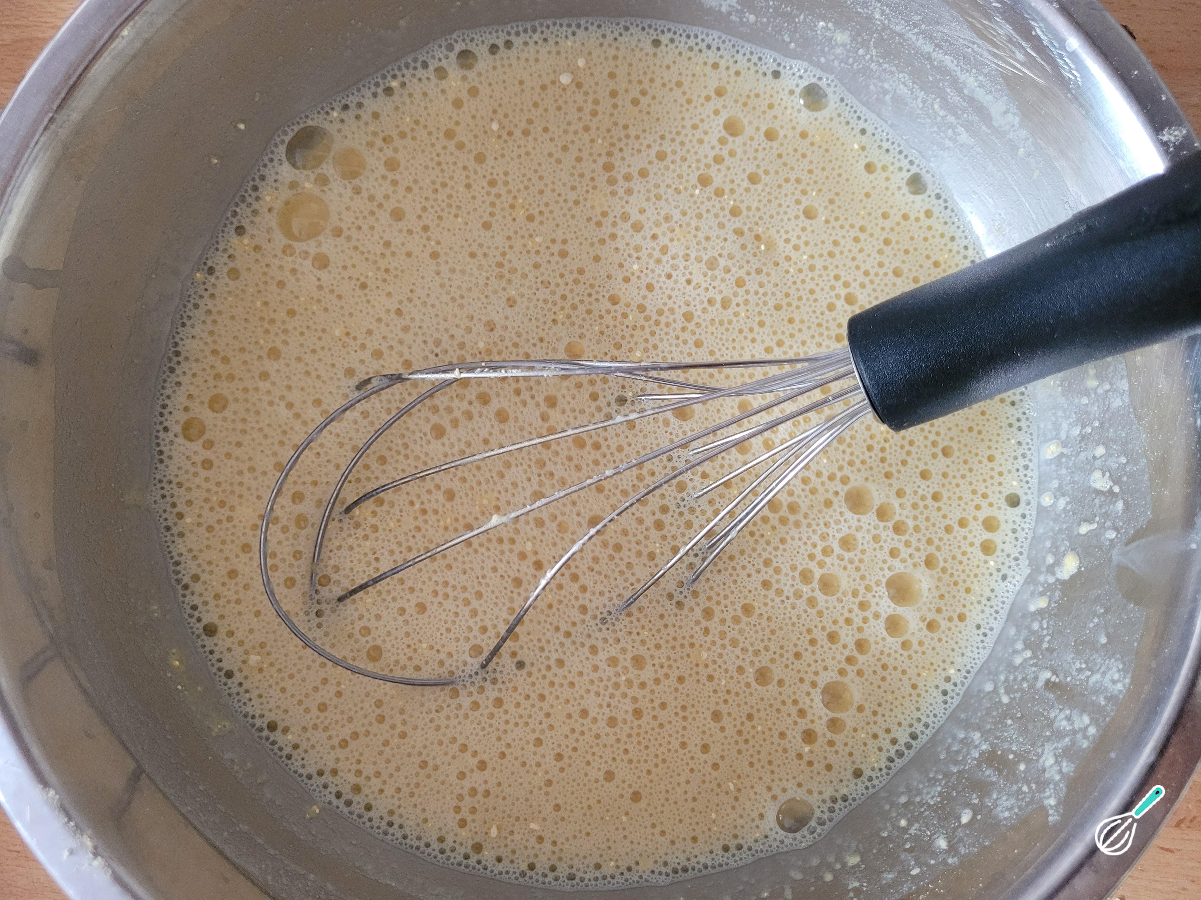 Em uma tigela, misture a farinha de grão de bico, o sal, a pimenta do reino e a água e misture bem para formar uma massa homogênea e sem gruminhos. Enquanto isso, bata o ovo em uma tigela separada.