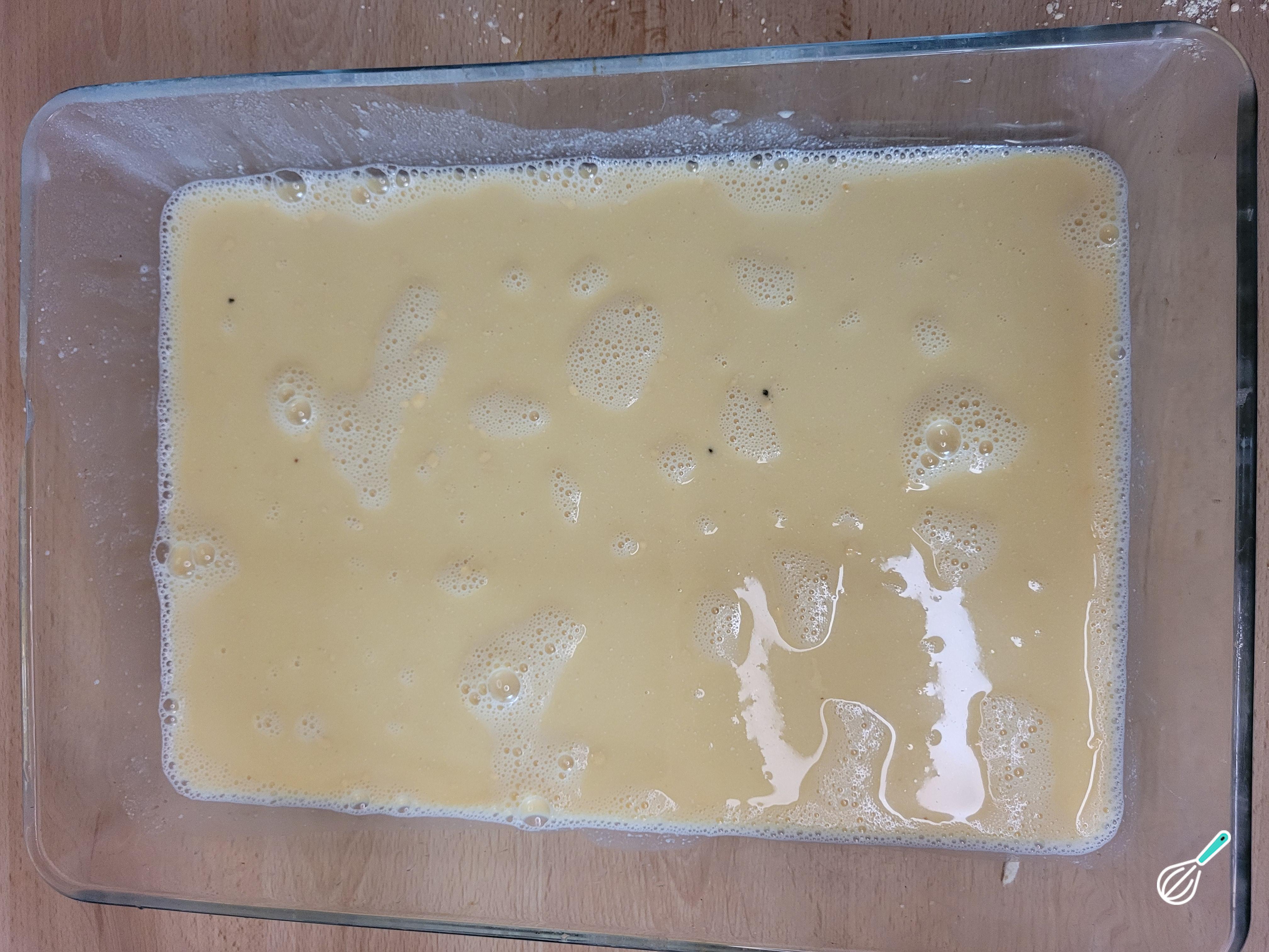 Transfira a massa para uma forma, de preferência de vidro. O ideal é que a massa fique fininha para que fique firme no meio. Jogue o ovo batido por cima e leve ao forno a 180oC por pelo menos 40 minutos, verificando se a massa já está firme no meio.