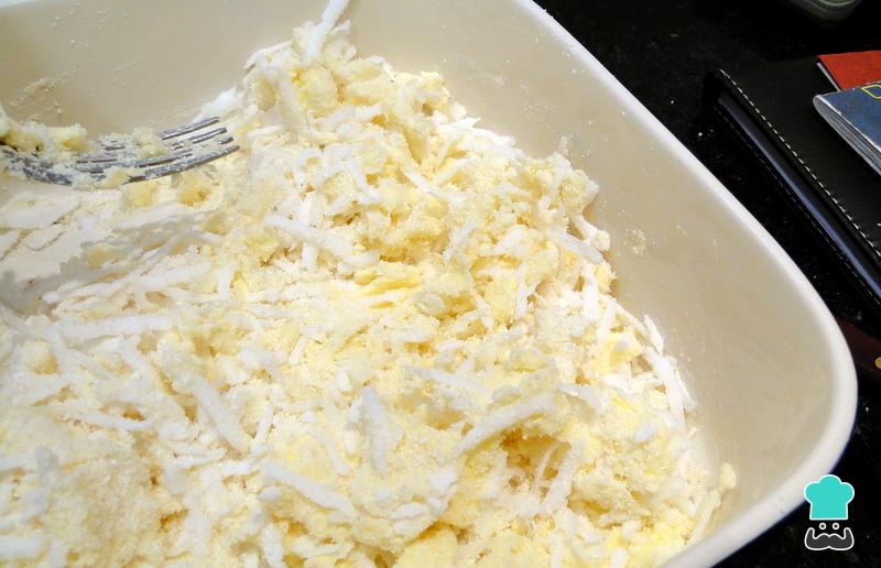 Para preparar o quindim da Palmirinha, que nesse caso é um quindão, comece por misturar o coco ralado, o açúcar e a manteiga.