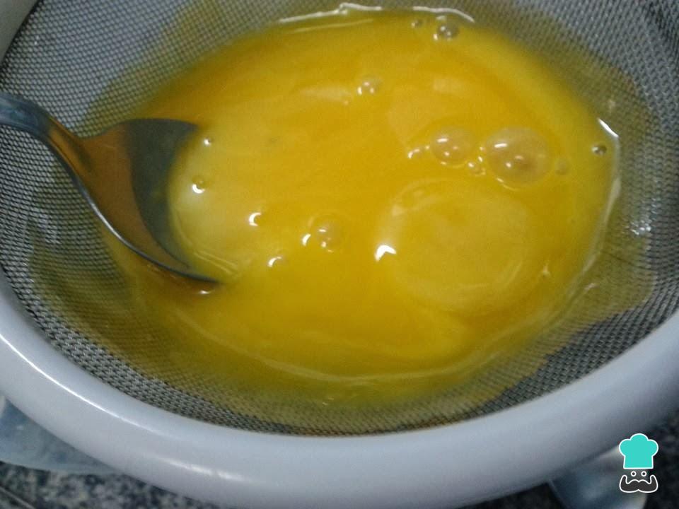 Na direção dos ingredientes anteriores peneire os ovos e as gemas,para evitar o gosto e cheiro de ovo, e misture tudo muito bem.