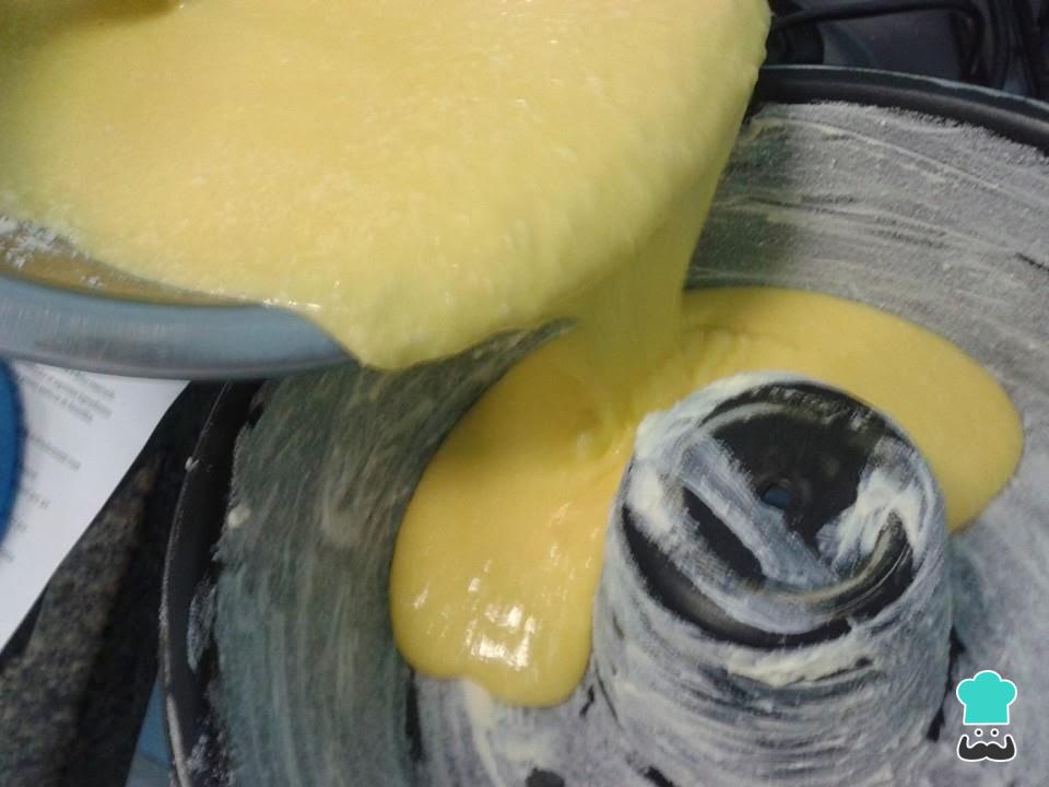 Em seguida unte e polvilhe açúcar refinado ou de confeiteiro numa forma de pudim ou de bolo com furo central, e coloque aí a mistura do quindim.